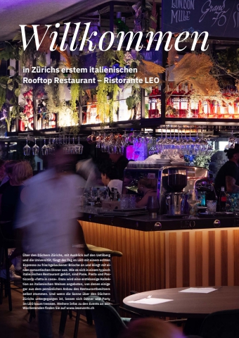 54 meine-region.ch Vereine%u00dcber den D%u00e4chern Z%u00fcrichs, mit Ausblick auf den Uetliberg und die Universit%u00e4t, f%u00e4ngt der Tag im LEO mit einem echten Espresso zu frischgebackener Brioche an und klingt mit einem romantischen Dinner aus. Wie es sich in einem typisch italienischen Restaurant geh%u00f6rt, sind Pane, Pasta und Pasticcerie %u00abfatta in casa%u00bb. Dazu wird eine erstklassige Kollektion an italienischen Weinen angeboten, von denen einige gar aus dem pers%u00f6nlichen Anbau des Restaurantbesitzers selbst stammen. Und wenn die Sonne %u00fcber den D%u00e4chern Z%u00fcrichs untergegangen ist, lassen sich Dinner und Party im LEO kaum trennen. Weitere Infos zu den Events an den Wochenenden fi nden Sie auf www.leoevents.chin Z%u00fcrichs erstem italienischenRooftop Restaurant %u2013 Ristorante LEOWillkommen