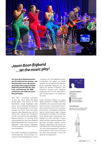 meine-region.ch meine-region.ch Vereine 551Jason Boon Bigband %u2026 let the music play!Die Jason Boon Big Band besteht aus 20 ambitionierten Amateur- und Berufsmusiker:innen. Wir spielen ein breites sowie anspruchsvolles Repertoire aus der Welt der Jazz-, Funk- und Popmusik. Die JBBB entstand im Jahr 2005 aus einem Musical Projekt.Seit ihrer Gr%u00fcndung entwickelte sich die Jason Boon Big Band stetig weiter und konnte in ihrer Geschichte einige Highlights realisieren. So zum Beispiel die Ballnacht Kloten, vier Swingnights auf Schloss Sargans mit Patric Scott und vielen anderen tollen S%u00e4nger:innen, die Teilnahme bei %u00abKampf der Orchester%u00bb im SRF und nat%u00fcrlich die legend%u00e4ren Bigband Battles. Im Sommer 2022 veranstalteten wir das erste Bigband Battle Weekend Kloten mit total sechs Bigbands. Viele unserer Highlights sind auf unserem YouTube-Kanal zusammengefasst. Wir spielen Big Band Arrangements verschiedenster Stilrichtungen mit und ohne Gesangsbegleitung. Gerne umrahmen wir Ihren geplanten Event musikalisch. Wir gehen, wo immer m%u00f6glich, auf die Bed%u00fcrfnisse des von Ihnen geplanten Anlasses ein. Wir bieten ein breites Programm, vom einfachen Konzert ohne Gesangsbegleitung bis hin zum abendf%u00fcllenden Showprogramm mit Gastk%u00fcnstler:innen.Unser aktuelles Projekt ist Ladies Night und kam im Fr%u00fchjahr 2023 auf die B%u00fchne. Eine unerschrockene Bigband und drei umwerfende Frauen:das Versprechen f%u00fcr einen unvergesslichen Event. Ja, Bigband und Gesang, das ist nichts Neues, aber in dieser Kombination einmalig. Ein musikalischer Abend voller Frauenpower. Die Bigband mit dem h%u00f6chsten Frauenanteil und drei beeindruckende S%u00e4ngerinnen sprengen jegliche GenreGrenzen. Zusammen mit Chrissi Sokoll, Diana Fehr und Irina Bard bringen wir unser lange geplantes Programm auf die B%u00fchne. Freut Euch auf Songs aus allen Stilrichtungen in noch nie geh%u00f6rten Arrangements.Jason Boon Big Band8302 Kloteninfo@jbbb.chwww.jbbb.ch JasonBoonBigBand%u0009%u0009%u0009%u0009%u0009%u0009%u0009%u0009%u0009jasonboonbigband JasonBoonBigBandVeranstaltungenAktuelle Termine entnehmen Sie bitte immer unserer Webseite.