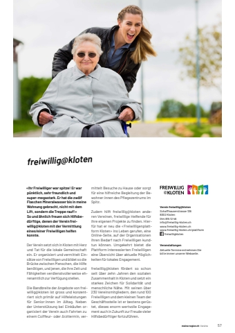 meine-region.ch meine-region.ch Vereine 571freiwillig@kloten%u00abIhr Freiwilliger war spitze! Er war p%u00fcnktlich, sehr freundlich und super-megastark. Er hat die zw%u00f6lf Flaschen Mineralwasser bis in meine Wohnung gebracht, nicht mit dem Lift, sondern die Treppe rauf!%u00bb So und %u00e4hnlich freuen sich Hilfsbed%u00fcrftige, denen der Verein freiwillig@kloten mit der Vermittlung eines/einer Freiwilligen helfen konnte.Der Verein setzt sich in Kloten mit Herz und Tat f%u00fcr die lokale Gemeinschaft ein. Er organisiert und vermittelt Eins%u00e4tze von Freiwilligen und bildet so die Br%u00fccke zwischen Menschen, die Hilfe ben%u00f6tigen, und jenen, die ihre Zeit und F%u00e4higkeiten verdienstvollerweise ehrenamtlich zur Verf%u00fcgung stellen.Die Bandbreite der Angebote von freiwillig@kloten ist gross und konzentriert sich prim%u00e4r auf Hilfeleistungen f%u00fcr Senior:innen im Alltag. Neben der Unterst%u00fctzung bei Eink%u00e4ufen organisiert der Verein auch Fahrten zu einem Coiffeur- oder Arzttermin, vermittelt Besuche zu Hause oder sorgt f%u00fcr eine hilfreiche Begleitung der Bewohner:innen des Pfl egezentrums im Spitz.Zudem hilft freiwillig@kloten anderen Vereinen, freiwillige Helfende f%u00fcr ihre eigenen Projekte zu fi nden. Hierf%u00fcr hat er neu die %u00abFreiwilligenplattform Kloten%u00bb ins Leben gerufen, eine Online-Seite, auf der Organisationen ihren Bedarf nach Freiwilligen kundtun k%u00f6nnen. Umgekehrt bietet die Plattform interessierten Freiwilligen eine %u00dcbersicht %u00fcber aktuelle M%u00f6glichkeiten f%u00fcr lokales Engagement.freiwillig@kloten f%u00f6rdert so schon seit %u00fcber zehn Jahren den sozialen Zusammenhalt in Kloten und setzt ein starkes Zeichen f%u00fcr Solidarit%u00e4t und menschliche N%u00e4he. Mit seinen %u00fcber 230 Vereinsmitgliedern, den rund 100 Freiwilligen und dem kleinen Team der Gesch%u00e4ftsstelle ist er bestens ger%u00fcstet, dieses enorm wertvolle Engagement auch in Zukunft zur Freude vieler Hilfsbed%u00fcrftiger fortzuf%u00fchren.Verein freiwillig@klotenSchaffhauserstrasse 1368302 Kloten044 815 12 46info@freiwillig-kloten.chwww.freiwillig-kloten.chwww.freiwillig-kloten.ch/plattform freiwilligklotenVeranstaltungenAktuelle Termine entnehmen Sie bitte immer unserer Webseite.