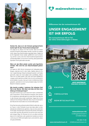 1 meine-region.ch Jungtalent meine-region.ch Vereine 59%u00abIch will wieder so spielen, wie im 2022%u00bbDie 17-j%u00e4hrige Jill Kr%u00e4henb%u00fchl stand 2022 im Final der U19-Beachvolleyball-Schweizer,meisterschaft. Wenige Tage sp%u00e4ter wurde bei der talen,tierten Sportlerin Leu k%u00e4mie diagnostiziert. Nach einer Stammzelltransplantation ist sie nun zur%u00fcck im Sand. Anfang 2023 mussten Sie sich einer Stammzelltrans,plantation unterziehen. Wie sieht nun die sportliche Situation aus?Ich bin mittlerweile wieder so gut wie zur%u00fcck im Sport,lerinnen-Alltag. Ich trainiere wieder wie fr%u00fcher und konnte im Oktober sogar an einem Turnier teilnehmen. Es ist aber schon noch ein grosser Schritt, bis ich wie,der an dem Punkt ankomme, wo ich vor der Diagnose stand. Ist letzteres Ihr Ziel f%u00fcr 2024?Ja, ich will wieder so spielen, wie ich es 2022 getan habe. Da die Stammzelltransplantation im Februar stattgefunden hat, war es gar nicht m%u00f6glich, in dieser Saison an Turnieren teilzunehmen. Wie schauen Sie heute auf dieses sehr schwierige Jahr zur%u00fcck?Ich denke vor allem, dass ich grosses Gl%u00fcck hatte, gleich mehrere passende Spender:innen f%u00fcr eine Stammzell,transplantation gefunden zu haben. Es f%u00fchlt sich an, als h%u00e4tte ich dadurch eine zweite Chance erhalten. Viele Leute, die an Leuk%u00e4mie erkranken, bekommen diese Chance nicht. Durch die Stammzelltransplantation habe ich viel Hoffnung, dass alles wieder so werden kann wie fr%u00fcher. Ausserdem werde ich den Spender:innen gegen%u00fcber f%u00fcr immer dankbar sein. In der Schweiz ist es nicht m%u00f6glich zu erfahren, wer gespendet hat, was bedeutet, dass mir ein Mensch, den ich nie kennenlernen werde, das Leben gerettet hat. Jetzt aktiv werden und Blutstammzellen spenden!Jill Kr%u00e4henb%u00fchl gilt als grosses Talent des Schweizer Beachvolleyballs. Denken Sie, dass es in der Schweiz gen%u00fcgend Sichtbarkeit gibt f%u00fcr das Thema Stammzellspende?Ich sage es so: Bevor mir klar wurde, dass ich einen solchen Eingriff n%u00f6tig haben werde, wusste ich selbst nicht, dass man Stammzellen spenden kann. Dabei ist es f%u00fcr Spender:innen weder gef%u00e4hrlich noch schwierig und f%u00fcr Leute, die eine Stammzelltransplantation notwendig haben, ist es enorm wichtig, dass passende Spender:innen gefunden werden. Wenn wir den Blick wieder zur%u00fcck aufs Sportliche wenden: Wie sind Sie zum Beachvolleyball gekommen?Ich habe im VBC Z%u00fcrich Unterland mit Volleyball angefangen, damals noch in der Halle. Sp%u00e4ter ging ich immer regelm%u00e4ssiger Beachvolleyball spielen und habe gemerkt, dass ich mich dabei sehr wohlf%u00fchle. Wenn man nur zu zweit spielt, hat man viel mehr Ballber%u00fchrungen und ist aktiver am Ball. Als ich mich schliesslich entscheiden musste, hat auch mein Umfeld eine Rolle gespielt, weshalb ich mich entschieden habe, f%u00fcr ZUZU Beach im Sand zu spielen. Wie bereits erw%u00e4hnt, trainieren Sie teilweise f%u00fcnf Mal in der Woche. Wie l%u00e4sst sich dies mit Ihrer Ausbildung in Einklang bringen?Das geht ziemlich gut, auch weil mich mein Lehrbetrieb sehr unterst%u00fctzt. Ich bin aktuell im zweiten Jahr meiner KV-Ausbildung, deshalb gehe ich zwei Mal in der Woche in die Schule und an den restlichen Tagen bin ich jeweils am Vormittag im Betrieb. Dazu muss ich einmal in der Woche f%u00fcr Kontrollen ins Universit%u00e4tsspital. Eine Karriere als professionelle Athletin w%u00e4re der grosse Traum. In der Schweiz muss man dazu aber zu den allerbesten Athletinnen geh%u00f6ren. Das ist eine sehr kleine Gruppe, die das kann und auch bei ihnen sind Sponsoren sehr wichtig. Bis dorthin ist es f%u00fcr mich noch ein sehr langer Weg. Im Moment ist mir vor allem wichtig, dass ich im n%u00e4chsten Jahr spielerisch wieder an meine Leistung vom 2022 ankn%u00fcpfen kann und nat%u00fcrlich, dass ich gesund bleibe. Inserat halbseitig, 101 x 297 mmWillkommen bei der meinwohntraum AGUNSER ENGAGEMENTIST IHR ERFOLGDie meinwohntraum AG ist Teilder stimo Unternehmungen in Kloten. meinwohntraum AGLindengartenstrasse 6CH 8302 Kloten044 800 70 80www.meinwohntraum.ch info@meinwohntraum.chWillkommen bei der meinwohntraum AGUNSER ENGAGEMENTIST IHR ERFOLGDie meinwohntraum AG ist Teilder stimo Unternehmungen in Kloten. meinwohntraum AGLindengartenstrasse 6CH 8302 Kloten044 800 70 80info@meinwohntraum.ch www.meinwohntraum.chWillkommen bei der meinwohntraum AGUNSER ENGAGEMENTIST IHR ERFOLGDie meinwohntraum AG ist Teilder stimo Unternehmungen in Kloten. meinwohntraum AGLindengartenstrasse 6CH 8302 Kloten044 800 70 80www.meinwohntraum.ch info@meinwohntraum.chWillkommen bei der meinwohntraum AGUNSER ENGAGEMENTIST IHR ERFOLGDie meinwohntraum AG ist Teilder stimo Unternehmungen in Kloten. meinwohntraum AGLindengartenstrasse 6CH 8302 Kloten044 800 70 80info@meinwohntraum.ch www.meinwohntraum.ch