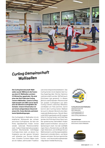 meine-region.ch meine-region.ch Vereine 651Curling Gemeinschaft WallisellenDie Curling Gemeinschaft Wallisellen wurde 1998 durch die Fusion aus dem CC Wallisellen und dem CC Winterthur gegr%u00fcndet. Sie sind einer der f%u00fcnf Clubs des Curling Centers Wallisellen. Unsere Curlinghalle besteht seit 1967 und ist damit eine der %u00e4ltesten Curlinghallen der Schweiz. Unsere Infrastruktur ist auf einem zeitgem%u00e4ssen Stand mit einem CO2-freien Betrieb und bietet beste Spielbedingungen. Die Curlinghalle in Wallisellen ist ein etablierter St%u00fctzpunkt der schweizerischen Curlingszene. Auf den vier Rinks (Spielbahnen) fi nden immer wieder nationale Meisterschaften statt. Zudem fi nden beinahe an jedem zweiten Wochenende mehrt%u00e4gige Curlingturniere statt, an denen Curlingteams aus der ganzen Schweiz und teilweise aus Europa teilnehmen. Einzelne Turniere haben mehr als ein halbes Jahrhundert Tradition und sind entsprechend bekannt. Das Curling Center ist ein Spielort der Curling Superliga (der Z%u00fcrcher Kantonsmeisterschaft) und der SIEPaG (auch Z%u00fcrichsee-Liga genannt). In diesen j%u00e4hrlich stattfi ndenden Meisterschaften spielen Curlingteams aus allen Curling Centern zwischen Wetzikon und Baden um Titel und Ehre. Somit kommt dem Curling Center Wallisellen auch in diesem Bereich eine %u00fcberregionale Bedeutung zu. Derzeit %u00fcben rund 220 Erwachsene und 30 Jugendliche im Curling Center von Ende September bis Mitte April ihren Sport aus. Die spielerischen Aktivit%u00e4ten fi nden dabei sowohl im Breiten- wie auch im Spitzensport statt. Von der zw%u00f6lfj%u00e4hrigen Cherry-Rockerin bis zum 85-j%u00e4hrigen Veteranen, vom Anf%u00e4nger bis zur Weltmeisterin und OlympiamedaillenGewinnerin sind alle Alters- und Spielklassen vertreten. Der bunt gemischte Turnier- und Veranstaltungskalender tr%u00e4gt dieser Vielfalt Rechnung.Curling Gemeinschaft WallisellenZielackerstrasse%u0009288304 Walliselleninfo@cgwallisellen.chwww.cgwallisellen.chwww.curling-wallisellen.chVeranstaltungenAktuelle Termine entnehmen Sie bitte immer unserer Webseite.