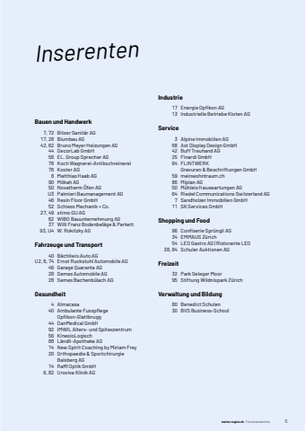meine-region.ch Firmenverzeichnis 5Pflege und Betreuung in wohnlichem Umfeld. Sie finden Almacasa an f%u00fcnf Standorten.Mitten in der Gemeinde oder im Quartier bietet Almacasa professionelle Betreuung f%u00fcr %u00e4ltere und pfi egebed%u00fcrftige Menschen, die ihr Leben vor%u00fcbergehend oder auf Dauer nicht mehr alleine bew%u00e4ltigen k%u00f6nnen. Was Sie von uns erwarten k%u00f6nnen:%u2022 Langzeitaufenthalte aller Pfi egestufen%u2022 Palliative Pfi ege%u2022 freie Arztwahl (Heimarztbetreuung m%u00f6glich)%u2022 *Tages-/Nachtentlastungsaufenthalte, um pfi egenden Angeh%u00f6rigen Erholung zu erm%u00f6glichen%u2022 Akut- und %u00dcbergangspfi ege nach Spitalaufenthalt%u2022 Ferienaufenthalte, 1 bis 5 WochenAlmacasa ist von allen Krankenkassen anerkannt. Unsere Tarife liegen im Rahmen der Erg%u00e4nzungsleistungen des Kanton Z%u00fcrich. Der Aufenthalt im Almacasa ist daher in der Regel unabh%u00e4ngig von Einkommen und Verm%u00f6gen ff nanzierbar.* Basispreis Tagesaufenthalt: Fr. 123.%u2013Aufenthalte m%u00f6glich in Weisslingen, Friesenberg und RegensdorfAlmacasa OberengstringenZ%u00fcrcherstrasse 708102 Oberengstringen +41 43 544 22 22oberengstringen@almacasa.chAlmacasa FriesenbergSchweighofstrasse 2308045 Z%u00fcrich+41 58 100 80 80friesenberg@almacasa.chAlmacasa PfungenBahnhofstrasse 78422 Pfungen+41 52 544 99 99pfungen@almacasa.chAlmacasa bildet aus!%u00abDr. Age%u00bb auf Radio 1 jeden Sonntag und als Podcast!Almacasa WeisslingenDorfstrasse 3b8484 Weisslingen+41 52 544 44 44weisslingen@almacasa.chAlmacasa RegensdorfIm Stockenhof 188105 RegensdorfAb M%u00e4rz 2024 fi nden Sie Almacasa auch in Regensdorf!Almacasa RegensdorfAb M%u00e4rz 2024Neuer%u00f6ff nungBauen und Handwerk%u0009 7, 72%u0009 Bitzer Sanit%u00e4r AG%u0009 17, 28%u0009 Blumbau AG%u0009 42, 62%u0009 Bruno Meyer Heizungen AG%u0009 44%u0009 DecorLab GmbH%u0009 56%u0009 EL. Group Sprecher AG%u0009 78%u0009 Koch Wagnerei-Antikschreinerei%u0009 76%u0009 Koster AG%u0009 8%u0009 Matthias Haab AG%u0009 90%u0009 M%u00f6kah AG%u0009 50%u0009 Novatherm %u00d6fen AG%u0009 U3%u0009 Palmieri Baumanagement AG%u0009 46%u0009 Resin Floor GmbH%u0009 52%u0009 Schiess Mechanik + Co.%u0009 27, 49%u0009 stimo GU AG%u0009 62%u0009 WIBO Bauunternehmung AG%u0009 37%u0009 Willi Franz Bodenbel%u00e4ge & Parkett%u0009 93, U4%u0009 W. Rokitzky AGFahrzeuge und Transport%u0009 40%u0009 B%u00e4chliwis Auto AG%u0009U2, 6, 74%u0009 Ernst Ruckstuhl Automobile AG%u0009 46%u0009 Garage Quaranta AG%u0009 28%u0009 Semes Automobile AG%u0009 28%u0009 Semes Bachenb%u00fclach AGGesundheit%u0009 4%u0009 Almacasa%u0009 40%u0009 Ambulante Fusspflege%u0009 %u0009 Opfikon-Glattbrugg%u0009 44%u0009 DanMedical GmbH%u0009 92%u0009 IMWIL Alters- und Spitexzentrum%u0009 56%u0009 KinesioLogisch%u0009 88%u0009 L%u00e4ndli-Apotheke AG%u0009 14%u0009 New Spirit Coaching by Miriam Frey%u0009 20%u0009 Orthopaedie & Sportchirurgie Balsberg AG%u0009 14%u0009 Raffl Optik GmbH%u0009 6, 82%u0009 Uroviva Klinik AGIndustrie%u0009 17%u0009 Energie Opfikon AG%u0009 13%u0009 Industrielle Betriebe Kloten AGService%u0009 3%u0009 Alpine Immobilien AG%u0009 68%u0009 Ast Display Design GmbH%u0009 42%u0009 Buff Treuhand AG%u0009 25%u0009 Finardi GmbH%u0009 64%u0009 FLINTWERK%u0009 %u0009 Gravuren & Beschriftungen GmbH%u0009 59%u0009 meinwohntraum.ch%u0009 86%u0009 Miplan AG%u0009 50%u0009 M%u00fchleis Hauswartungen AG%u0009 64%u0009 Riedel Communications Switzerland AG%u0009 7%u0009 SandholzerImmobilien GmbH%u0009 11%u0009 SK Services GmbHShopping und Food%u0009 96%u0009 Confiserie Spr%u00fcngli AG%u0009 34%u0009 EMMAUS Z%u00fcrich%u0009 54%u0009 LEO Gastro AG | Ristorante LEO%u0009 38, 84%u0009 Schuler Auktionen AGFreizeit%u0009 32%u0009 Park Seleger Moor%u0009 95%u0009 Stiftung Wildnispark Z%u00fcrichVerwaltung und Bildung%u0009 80%u0009 Benedict Schulen%u0009 30%u0009 BVS Business-SchoolInserenten