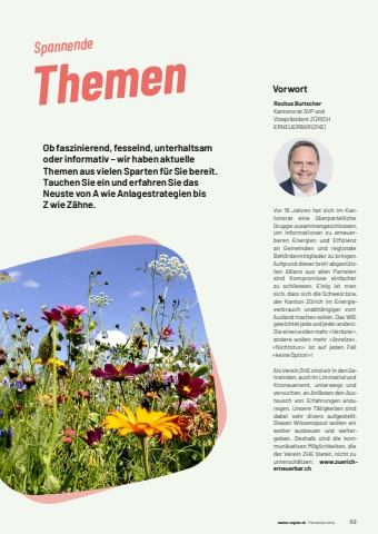 meine-region.ch meine-region.ch Themenberichte Themenberichte 691ThemenOb faszinierend, fesselnd, unterhaltsam oder informativ %u2013 wir haben aktuelle Themen aus vielen Sparten f%u00fcr Sie bereit. Tauchen Sie ein und erfahren Sie das Neuste von A wie Anlagestrategien bis Z wie Z%u00e4hne. SpannendeVorwortRochus BurtscherKantonsrat SVP undVizepr%u00e4sident Z%u00dcRICH ERNEUERBAR (ZHE)Vor 16 Jahren hat sich im Kantonsrat eine %u00fcberparteiliche Gruppe zusammengeschlossen, um Informationen zu erneuerbaren Energien und Effi zienz an Gemeinden und regionale Beh%u00f6rdenmitglieder zu bringen. Aufgrund dieser breit abgest%u00fctzten Allianz aus allen Parteien sind Kompromisse einfacher zu schliessen. Einig ist man sich, dass sich die Schweiz bzw. der Kanton Z%u00fcrich im Energieverbrauch unabh%u00e4ngiger vom Ausland machen sollen. Das WIE gewichtet jede und jeder anders:Die einen wollen mehr %u00abVerbote%u00bb, andere wollen mehr %u00abAnreize%u00bb. %u00abNichtstun%u00bb ist auf jeden Fall %u00abkeine Option%u00bb! Als Verein ZHE sind wir in den Gemeinden, auch im Limmattal und Knonauer amt, unterwegs und versuchen, an Anl%u00e4ssen den Austausch von Erfahrungen anzuregen. Unsere T%u00e4tigkeiten sind dabei sehr divers aufgestellt. Diesen Wissenspool wollen wir weiter ausbauen und weitergeben. Deshalb sind die kommunikativen M%u00f6glichkeiten, die der Verein ZHE bietet, nicht zu untersch%u00e4tzen: www.zuericherneuerbar.ch
