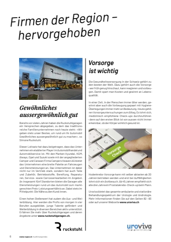 61 meine-region.ch meine-region.ch Kurzfirmenportr%u00e4ts TeaserFirmen der Region %u2013 hervorgehobenVorsorge ist wichtigDie Gesundheitsversorgung in der Schweiz geh%u00f6rt zu den besten der Welt. Dazu geh%u00f6rt auch die Vorsorge %u2013 wer fr%u00fch genug hinschaut, kann reagieren und vorbeugen. Damit spart man Kosten und gewinnt an Lebensqualit%u00e4t.In einer Zeit, in der Menschen immer %u00e4lter werden, gewinnt aber auch die Vorbeugung gepaart mit Hygiene%u00dcberlegungen immer mehr an Bedeutung. Heute geh%u00f6ren Vorsorgeuntersuchungen zum Alltag. Es lohnt sich, medizinisch empfohlene Check-ups durchzuf%u00fchren %u2013 denn auf den ersten Blick ist von aussen nicht immer erkennbar, ob der K%u00f6rper wirklich gesund ist.Hodenkrebs-Vorsorge kann mit selber abtasten ab 20 Jahren betrieben werden und erst bei Auff%u00e4lligkeiten lohnt sich ein Arztbesuch. Ab 45 Jahren empfi ehlt sich alle drei Jahre ein Prostatakrebs-Check-up beim Mann. Uroviva bietet das gesamte ambulante und station%u00e4re Behandlungsspektrum der Urologie und Andrologie. Mehr Informationen fi nden Sie auf den Seiten 82 %u2013 83 oder auf unserer Webseite www.uroviva.chGew%u00f6hnliches aussergew%u00f6hnlich gutBereits vor vielen Jahren haben die Ruckstuhlgaragen ein Versprechen abgegeben, zu dem das traditionsreiche Familienunternehmen noch heute steht: %u00abWir geben stets unser Bestes, um rund um Ihr Automobil Gew%u00f6hnliches aussergew%u00f6hnlich gut zu machen%u00bb, so Simone Ruckstuhl.Dieser Leitsatz hat dazu beigetragen, dass das Unternehmen ein etablierter Player im Automobilhandel und Automobilservice ist. Mit den Marken Hyundai, KGM, Aiways, Opel und Suzuki sowie mit der angegliederten Camper und Caravan Firma Campers Heaven AG bietet das Unternehmen eine breite Palette an Fahrzeugen und Dienstleistungen an. Das Unternehmen ist dabei nicht nur im Vertrieb stark, sondern hat auch Teile und Zubeh%u00f6r, Betriebsstoffe, Bereifung, Reparaturen, Service- sowie Carrosseriearbeiten im Angebot. An insgesamt f%u00fcnf Standorten bieten die Garagen alle Dienstleistungen rund um das Automobil zum marktgerechten Preis-Leistungsverh%u00e4ltnis an. Dabei stets im Mittelpunkt: Die N%u00e4he zu den Kund:innen.Einen hohen Stellenwert hat zudem die Aus- und Weiterbildung. Hier werden die Profi s von morgen in vier Berufen ausgebildet, junge Talente gef%u00f6rdert und Weiterbildung in diversen Bereichen aktiv unterst%u00fctzt. Erfahren Sie mehr %u00fcber Ruckstuhlgaragen und deren Angebote unter www.ruckstuhlgaragen.ch.