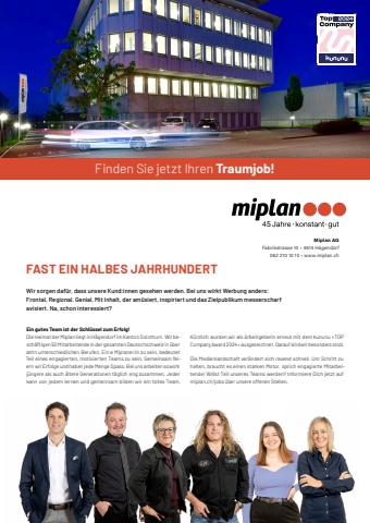 86 meine-region.ch InhaltWir sorgen daf%u00fcr, dass unsere Kund:innen gesehen werden. Bei uns wirkt Werbung anders: Frontal. Regional. Genial. Mit Inhalt, der am%u00fcsiert, inspiriert und das Zielpublikum messerscharf avisiert. Na, schon interessiert?FAST EIN HALBES JAHRHUNDERT5fifffflffifl%u001a%u0019%u0018%u0017fifffflffifl%u001a%u0019%u0018ffiff%u0019%u0019%u0017%u0016%u0015%u0014%u0016%u0013%u0016%u0012%u0011%u0015%u0012%u0016%u0010%u000f%u000e%u0017%u000c%u000bffi%u0014%u0011%u0009%u0016%u0009%u0015%u0014%u0016%u0015%u0014%u0016%u0015%u0014%u0016%u0013%u0016%u0008%u0008%u0008%u0007%u0006fl%u0005%u0004ff%u0007%u0003Ein gutes Team ist der Schl%u00fcssel zum Erfolg!Die Heimat der Miplan liegt in H%u00e4gendorf im Kanton Solothurn. Wir besch%u00e4ftigen 50 Mitarbeitende in der gesamten Deutschschweiz in %u00fcber zehn unterschiedlichen Berufen. Ein:e Miplaner:in zu sein, bedeutet Teil eines engagierten, motivierten Teams zu sein. Gemeinsam fei,ern wir Erfolge und haben jede Menge Spass. Bei uns arbeiten sowohl j%u00fcngere als auch %u00e4ltere Generationen t%u00e4glich eng zusammen. Jeder kann von jedem lernen und gemeinsam bilden wir ein tolles Team. K%u00fcrzlich wurden wir als Arbeitgeberin erneut mit dem kununu %u00abTOP Company Award 2024%u00bb ausgezeichnet. Darauf sind wir besonders stolz.Die Medienlandschaft ver%u00e4ndert sich rasend schnell. Um Schritt zu halten, braucht es einen starken Motor, sprich engagierte Mitarbei,tende! Willst Teil unseres Teams werden? Informiere Dich jetzt auf miplan.ch/jobs %u00fcber unsere offenen Stellen.Finden Sie jetzt Ihren Traumjob!CMYCMMYCYCMYKkununu_TopCompanyBadge_2024_CMYK.pdf 1 19.04.23 11:48