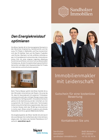 1 meine-region.ch Teaser meine-region.ch Inhalt 7Firmen der Region %u2013 hervorgehobenVorsorge ist wichtigDie Gesundheitsversorgung in der Schweiz geh%u00f6rt zu den besten der Welt. Dazu geh%u00f6rt auch die Vorsorge %u2013 wer fr%u00fch genug hinschaut, kann reagieren und vorbeu,gen. Damit spart man Kosten und gewinnt an Lebens,qualit%u00e4t.In einer Zeit, in der Menschen immer %u00e4lter werden, ge,winnt aber auch die Vorbeugung gepaart mit Hygiene,%u00dcberlegungen immer mehr an Bedeutung. Heute geh%u00f6,ren Vorsorgeuntersuchungen zum Alltag. Es lohnt sich, medizinisch empfohlene Check-ups durchzuf%u00fchren %u2013 denn auf den ersten Blick ist von aussen nicht immer erkennbar, ob der K%u00f6rper wirklich gesund ist.Hodenkrebs-Vorsorge kann mit selber abtasten ab 20 Jahren betrieben werden und erst bei Auff%u00e4lligkeiten lohnt sich ein Arztbesuch. Ab 45 Jahren empfi ehlt sich alle drei Jahre ein Prostatakrebs-Check-up beim Mann. Uroviva bietet das gesamte ambulante und station%u00e4re Behandlungsspektrum der Urologie und Andrologie. Mehr Informationen fi nden Sie auf den Seiten 82 %u2013 83 oder auf unserer Webseite www.uroviva.chGew%u00f6hnliches aussergew%u00f6hnlich gutBereits vor vielen Jahren haben die Ruckstuhlgaragen ein Versprechen abgegeben, zu dem das traditions,reiche Familienunternehmen noch heute steht: %u00abWir geben stets unser Bestes, um rund um Ihr Automobil Gew%u00f6hnliches aussergew%u00f6hnlich gut zu machen%u00bb, so Simone Ruckstuhl.Dieser Leitsatz hat dazu beigetragen, dass das Unter,nehmen ein etablierter Player im Automobilhandel und Automobilservice ist. Mit den Marken Hyundai, KGM, Aiways, Opel und Suzuki sowie mit der angegliederten Camper und Caravan Firma Campers Heaven AG bietet das Unternehmen eine breite Palette an Fahrzeugen und Dienstleistungen an. Das Unternehmen ist dabei nicht nur im Vertrieb stark, sondern hat auch Teile und Zubeh%u00f6r, Betriebsstoffe, Bereifung, Reparatu,ren, Service- sowie Carrosseriearbeiten im Angebot. An insgesamt f%u00fcnf Standorten bieten die Garagen alle Dienstleistungen rund um das Automobil zum markt,gerechten Preis-Leistungsverh%u00e4ltnis an. Dabei stets im Mittelpunkt: Die N%u00e4he zu den Kund:innen.Einen hohen Stellenwert hat zudem die Aus- und Wei,terbildung. Hier werden die Profi s von morgen in vier Berufen ausgebildet, junge Talente gef%u00f6rdert und Weiterbildung in diversen Bereichen aktiv unterst%u00fctzt. Erfahren Sie mehr %u00fcber Ruckstuhlgaragen und deren Angebote unter www.ruckstuhlgaragen.ch.Den Energiekreislauf optimierenDie Bitzer Sanit%u00e4r AG ist Ihre kompetente Partnerin in den Bereichen Engineering, Sanit%u00e4rtechnik und Heizung. Mit Filialen in Wallisellen und Maur konzentriert sich das 32-k%u00f6pfi ge Team auf die Region Flughafen und Z%u00fcrcher Oberland. Auf die erh%u00f6hten Anforderungen im Energiebereich antwortete das Unternehmen schon fr%u00fch mit einer eigenen Ingenieur-Abteilung. Kund:innen profi tieren von einer hoch professionellen Fachplanung, die den Energiekreislauf gesamtheitlich betrachtet und dabei stets Sparpotenziale f%u00fcr Private, Unternehmen und Institutionen auslotet.Beim Thema Wasser geh%u00f6rt die Bitzer Sanit%u00e4r AG zu den f%u00fchrenden Unternehmen der Region. Sie sorgt daf%u00fcr, dass Ihr Haus jederzeit mit sauberem Trinkwasser versorgt wird und in den richtigen Mengen sowie in bester Qualit%u00e4t zur Verf%u00fcgung steht. Eine weitere Kernkompetenz ist die Optimierung und der Unterhalt von Heizungstechnik. Der Einsatz modernster Technologien bietet erstaunliche Optimierungspotenziale. Aber auch in Sachen Design steht das 78-j%u00e4hrige Unternehmen in nichts nach. Bitzer entwirft moderne und stilvolle Nasszellen, bis hin zu ganzen B%u00e4derlandschaften. Die Angebotspalette der Bitzer Sanit%u00e4r AG wird durch die zuverl%u00e4ssigen Servicefachleute des Unternehmens abgerundet. Sie halten den Notfall-Pikettdienst 24/7 aufrecht. www.bitzer-ag.chInserat halbseitig, 101 x 297 mmImmobilienmaklermit LeidenschaftGutschein f%u00fcr eine kostenloseBewertungKontaktieren Sie unsSandholzerImmobiliensandholzer-immobilien.ch8400 Winterthur8702 Zollikon +41 52 212 18 54