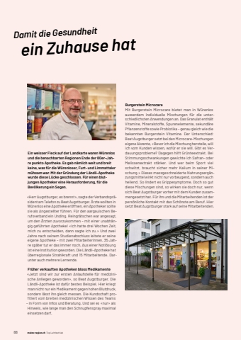881 meine-region.ch Top LehrbetriebDamit die Gesundheit ein Zuhause hatEin weisser Fleck auf der Landkarte waren W%u00fcrenlos und die benachbarten Regionen Ende der 80er-Jahre punkto Apotheke. Es gab n%u00e4mlich weit und breit keine, was f%u00fcr die W%u00fcrenloser, Furt- und Limmattaler m%u00fchsam war. Mit der Gr%u00fcndung der L%u00e4ndli- Apotheke wurde diese L%u00fccke geschlossen. F%u00fcr einen blutjungen Apotheker eine Herausforderung, f%u00fcr die Bev%u00f6lkerung ein Segen.%u00abHerr Augstburger, es brennt%u00bb, sagte der Verbandspr%u00e4sident am Telefon zu Beat Augstburger. %u00c4rzte wollten in W%u00fcrenlos eine Apotheke er%u00f6ffnen, ein Apotheker sollte sie als Angestellter f%u00fchren. F%u00fcr den aargauischen Berufsverband ein Unding. Reingr%u00e4tschen war angesagt, um den %u00c4rzten zuvorzukommen %u2013 mit einer unabh%u00e4ngig gef%u00fchrten Apotheke! %u00abIch hatte drei Wochen Zeit, mich zu entscheiden, dann sagte ich zu.%u00bb Und zwei Jahre nach seinem Studienabschluss leitete er seine eigene Apotheke %u2013 mit zwei Mitarbeiterinnen. 35 Jahre sp%u00e4ter tut er das immer noch. Aus einer Notl%u00f6sung ist eine Institution geworden. Die L%u00e4ndli- Apotheke hat %u00fcberregionale Strahlkraft und 15%u00a0Mitarbeitende. Darunter auch mehrere Lernende.Fr%u00fcher verkauften Apotheken bloss Medikamente%u00abJetzt sind wir zur ersten Anlaufstelle f%u00fcr medizinische Anliegen geworden%u00bb, so Beat Augstburger. Die L%u00e4ndli-Apotheke ist daf%u00fcr bestes Beispiel. Hier kriegt man nicht nur ein Medikament gegen hohen Blutdruck, sondern l%u00e4sst ihn gleich messen. Die Kundschaft profi tiert vom breiten medizinischen Wissen des Teams %u2013 in Form von Infos und Beratung. Und sei es %u00abnur%u00bb als Hinweis, wie lange man den Schnupfenspray maximal einsetzen darf. Burgerstein MicrocareMit Burgerstein Microcare bietet man in W%u00fcrenlos ausserdem individuelle Mischungen f%u00fcr die unterschiedlichsten Anwendungen an. Das Granulat enth%u00e4lt Vitamine, Mineralstoffe, Spurenelemente, sekund%u00e4re Pfl anzenstoffe sowie Probiotika %u2013 genau gleich wie die bekannten Burgerstein Vitamine. Der Unterschied:Beat Augstburger setzt bei den Microcare-Mischungen eigene Akzente, %u00abBevor ich die Mischung herstelle, will ich vom Kunden wissen, wof%u00fcr er sie will. Gibt es Verdauungsprobleme? Dagegen hilft Gr%u00fcnteextrakt. Bei Stimmungsschwankungen gewichte ich Safran- oder Melissen extrakt st%u00e4rker. Und wer beim Sport viel schwitzt, braucht sicher mehr Kalium in seiner Mischung.%u00bb Dieses massgeschneiderte Nahrungserg%u00e4nzungsmittel wirkt nicht nur vorbeugend, sondern auch heilend. So lindert es Grippesymptome. Doch so gut diese Mischungen sind, so wirken sie doch nur, wenn sich Beat Augstburger vorher mit dem Kunden zusammengesetzt hat. F%u00fcr ihn und die Mitarbeitenden ist der pers%u00f6nliche Kontakt mit das Sch%u00f6nste am Beruf. Hier setzt Beat Augstburger stark auf seine Mitarbeitenden.