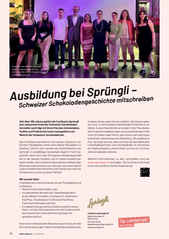 96 meine-region.ch Top Lehrbetrieb meine-region.ch Top Lehrbetriebe 1Confi serie Spr%u00fcngli AGBahnhofstrasse 218001%u0009Z%u00fcrich044 224 46 46bewerbungen@spruengli.chwww.spruengli.chAusbildung bei Spr%u00fcngli %u2013 Schweizer Schokoladengeschichte mitschreibenSeit %u00fcber 185 Jahren geh%u00f6rt die Confi serie Spr%u00fcngli zum exklusiven Kreis der Schweizer Schokoladenhersteller und tr%u00e4gt mit ihren frischen Schokoladen, Truffes und Pralin%u00e9s bis heute massgeblich zum Weltruf der Schweizer Schokolade bei.Das Familienunternehmen hat seinen Hauptsitz am Z%u00fcrcher Parade platz sowie eine eigene Manufaktur in Dietikon, Z%u00fcrich. Dort werden die K%u00f6stlichkeiten von Spr%u00fcngli in sorgf%u00e4ltiger Handarbeit t%u00e4glich frisch hergestellt, bevor sie in den 30 eigenen Verkaufsgesch%u00e4ften in der ganzen Schweiz und im nahen Ausland verkauft werden.Die Confi serie Spr%u00fcngli besch%u00e4ftigt %u00fcber 900 Arbeitnehmerinnen und -nehmer und vereint damit unterschiedlichste Menschen und Talente aus mehr als 40 Nationen zu einer grossen Familie. Wir suchen Dich!Und bieten an unseren Standorten am Paradeplatz und in Dietikon:%u2022 15 bis 20 Lehrstellen jedes Jahr%u2022 In spannenden Berufen wie: Detailhandelsfachleute, B%u00e4cker-Konditor-Confi seur/in, Kaufmann/ Kauffrau, Polydesigner/in 3D sowie Fachfrau/Fachmann Betriebsunterhalt%u2022 Ein abwechslungsreiches Arbeitsumfeld in einem Team, mit dem Du zusammen mit viel Leidenschaft die Zukunft des Unternehmens Spr%u00fcngli mitgestalten kannst.Nach einer erfolgreichen Bewerbung auf eine Lehrstelle erwartet die jungen Talente vielseitige Ausbildungen, in denen ihnen, wenn immer m%u00f6glich, die Chance geboten wird, in verschiedene Abteilungen Einblicke zu erhalten. So durchlaufen die Lernenden in der Manufaktur alle Produktionsabteilungen und Auszubildende im Bereich KV haben zwei Mal im Jahr einen mehrw%u00f6chigen Aufenthalt in Bereichen wie Marketing, HR und Backoffi ce. Spr%u00fcngli ist stolz, dass sie mehr als die H%u00e4lfte aller Lehrabg%u00e4ngerinnen und Lehrabg%u00e4nger im Anschluss ein Stellenangebot unterbreiten und sie so im Unternehmen behalten k%u00f6nnen.Weitere Informationen zu den Lehrstellen sind auf www.spruengli.ch verf%u00fcgbar. Die Confi serie Spr%u00fcngli freut sich auf Deine Online-Bewerbung!Pr%u00e4sident des Verwaltungsrates Milan Prenosil bei der Ehrung der Lernenden zum erfolgreichen Lehrabschluss 2023