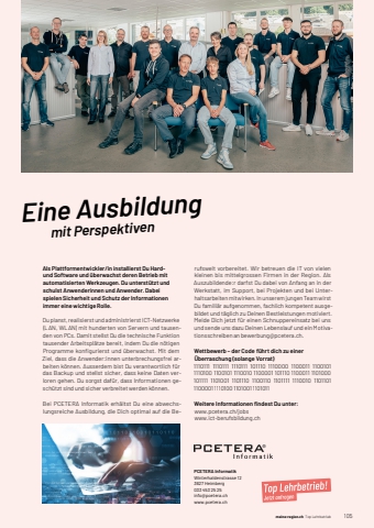 meine-region.ch meine-region.chTop Lehrbetriebe Top Lehrbetrieb 1051PCETERA InformatikWinterhaldenstrasse%u0009123627 Heimberg033 453 25 25info@pcetera.chwww.pcetera.chEine Ausbildung mit PerspektivenAls Plattformentwickler/in installierst Du Hardund Software und %u00fcberwachst deren Betrieb mit automatisierten Werkzeugen. Du unterst%u00fctzt und schulst Anwenderinnen und Anwender. Dabei spielen Sicherheit und Schutz der Informationen immer eine wichtige Rolle.Du planst, realisierst und administrierst ICT-Netzwerke (LAN, WLAN) mit hunderten von Servern und tausenden von PCs. Damit stellst Du die technische Funktion tausender Arbeitspl%u00e4tze bereit, indem Du die n%u00f6tigen Programme konfi gurierst und %u00fcberwachst. Mit dem Ziel, dass die Anwender:innen unterbrechungsfrei arbeiten k%u00f6nnen. Ausserdem bist Du verantwortlich f%u00fcr das Backup und stellst sicher, dass keine Daten verloren gehen. Du sorgst daf%u00fcr, dass Informationen gesch%u00fctzt sind und sicher verbreitet werden k%u00f6nnen.Bei PCETERA Informatik erh%u00e4ltst Du eine abwechslungsreiche Ausbildung, die Dich optimal auf die Berufswelt vorbereitet. Wir betreuen die IT von vielen kleinen bis mittelgrossen Firmen in der Region. Als Auszubildende:r darfst Du dabei von Anfang an in der Werkstatt, im Support, bei Projekten und bei Unterhaltsarbeiten mitwirken. In unserem jungen Team wirst Du famili%u00e4r aufgenommen, fachlich kompetent ausgebildet und t%u00e4glich zu Deinen Bestleistungen motiviert. Melde Dich jetzt f%u00fcr einen Schnuppereinsatz bei uns und sende uns dazu Deinen Lebenslauf und ein Motivationsschreiben an bewerbung@pcetera.ch.Wettbewerb %u2013 der Code f%u00fchrt dich zu einer %u00dcberraschung (solange Vorrat)1110111 1110111 1110111 101110 1110000 1100011 1100101 1110100 1100101 1110010 1100001 101110 1100011 1101000 101111 1101001 1101110 1100110 1101111 1110010 1101101 1100001 1110100 1101001 1101011Weitere Informationen fi ndest Du unter:www.pcetera.ch/jobswww.ict-berufsbildung.chmeine-region.ch Top Lehrbetriebe 1SwissP Defence AGSabine Schwenter, Leiterin BerufsbildungUttigenstrasse%u0009673602 Thun033 854 43 74www.swisspdefence.com Herzblutf%u00fcr die AusbildungAls f%u00fchrender europ%u00e4ischer Anbieter f%u00fcr Kleinkali,bermunition sind wir der zuverl%u00e4ssige Partner f%u00fcr Armee und Beh%u00f6rden. Die von uns entwickelte und produzierte Munition bew%u00e4hrt sich in anspruchs,vollen Eins%u00e4tzen auf der ganzen Welt. Dadurch tragen wir zum Missionserfolg und zu unser aller Sicherheit bei %u2013 heute und in Zukunft. Die Zukunft der Jugend liegt uns am Herzen. Wir bilden mit viel Engagement und Herzblut die verschiedenen Berufsbilder aus. Wir f%u00f6rdern und entwickeln unsere Lernenden und machen sie fi t f%u00fcr den Berufsalltag. Polymechaniker/in EFZAls Polymechaniker/in stellst Du bei uns Werkzeuge, Ger%u00e4teteile und Produktionsvorrichtungen aus Stahl, Chromstahl, Aluminium oder Sonderwerkstoffe her. Daf%u00fcr bedienst Du computergesteuerte Maschinen, die Du anhand von Konstruktionszeichnungen oder Modellen direkt vom Programmiersystem (CAM) der Kon struktion programmierst.In der Ausbildung bieten wir Dir viele verschiedene T%u00e4tigkeitsfelder an, z. B. Drehen, Fr%u00e4sen Schleifen, Ero,dieren, Polieren etc. Konstrukteur/in EFZAls Konstrukteur/in entwickelst, modellierst und konst,ruierst Du mechanische, elektrische und elektronische Ger%u00e4te, Maschinen und Anlagen. Du erstellst Dokumen,te f%u00fcr die Fertigung, die Montage, den Betrieb und die Instandhaltung von Ger%u00e4ten, Maschinen und Anlagen. Neben den Konstruktionszeichnungen enthalten diese auch Produktbeschreibungen, technische Daten sowie Bedienungs- und Wartungsanleitungen. Ein modernes CAD System unterst%u00fctzt Dich bei der Erstellung von Mo,dellen und Zeichnungen. Du machst die daf%u00fcr n%u00f6tigen Berechnungen und h%u00e4ltst auf den Pl%u00e4nen geometrische Formen, Masse und Tole,ranzen sowie Angaben zu Oberfl %u00e4chenbeschaffenheit und Werkstoffen fest.Kauffrau/Kaufmann EFZ Als Kaufmann oder Kauffrau %u00fcbernimmst Du verschie,dene administrative T%u00e4tigkeiten in unserem Unterneh,men. Du erh%u00e4ltst bei uns Einblick in sechs verschiedene Abteilungen und erlangst so ein breites und fundiertes Fachwissen. Wir bilden pro Lehrjahr jeweils zwei Ler,nende aus, so fi ndet auch ein aktiver Austausch statt.