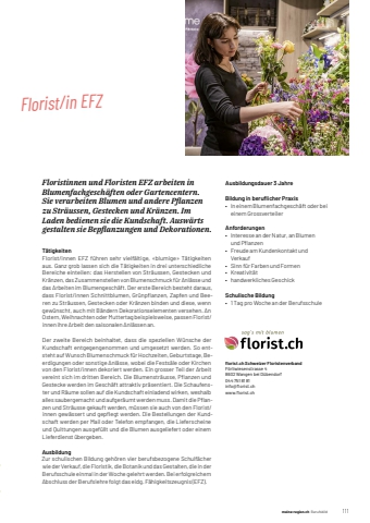 meine-region.ch meine-region.chBerufsbilder Berufsbild 111Florist/in EFZFloristinnen und Floristen EFZ arbeiten in Blumenfachgesch%u00e4ften oder Gartencentern. Sie verarbeiten Blumen und andere Pfl anzen zu Str%u00e4ussen, Gestecken und Kr%u00e4nzen. Im Laden bedienen sie die Kundschaft. Ausw%u00e4rts gestalten sie Bepfl anzungen und Dekorationen.T%u00e4tigkeitenFlorist/innen EFZ f%u00fchren sehr vielf%u00e4ltige, %u00abblumige%u00bb T%u00e4tigkeiten aus. Ganz grob lassen sich die T%u00e4tigkeiten in drei unterschiedliche Bereiche einteilen: das Herstellen von Str%u00e4ussen, Gestecken und Kr%u00e4nzen, das Zusammenstellen von Blumenschmuck f%u00fcr Anl%u00e4sse und das Arbeiten im Blumengesch%u00e4ft. Der erste Bereich besteht daraus, dass Florist/innen Schnittblumen, Gr%u00fcnpfl anzen, Zapfen und Beeren zu Str%u00e4ussen, Gestecken oder Kr%u00e4nzen binden und diese, wenn gew%u00fcnscht, auch mit B%u00e4ndern Dekorationselementen versehen. An Ostern, Weihnachten oder Muttertag beispielsweise, passen Florist/innen ihre Arbeit den saisonalen Anl%u00e4ssen an.Der zweite Bereich beinhaltet, dass die speziellen W%u00fcnsche der Kundschaft entgegengenommen und umgesetzt werden. So entsteht auf Wunsch Blumenschmuck f%u00fcr Hochzeiten, Geburtstage, Beerdigungen oder sonstige Anl%u00e4sse, wobei die Fests%u00e4le oder Kirchen von den Florist/innen dekoriert werden. Ein grosser Teil der Arbeit vereint sich im dritten Bereich. Die Blumenstr%u00e4usse, Pfl anzen und Gestecke werden im Gesch%u00e4ft attraktiv pr%u00e4sentiert. Die Schaufenster und R%u00e4ume sollen auf die Kundschaft einladend wirken, weshalb alles saubergemacht und aufger%u00e4umt werden muss. Damit die Pfl anzen und Str%u00e4usse gekauft werden, m%u00fcssen sie auch von den Florist/innen gew%u00e4ssert und gepfl egt werden. Die Bestellungen der Kundschaft werden per Mail oder Telefon empfangen, die Lieferscheine und Quittungen ausgef%u00fcllt und die Blumen ausgeliefert oder einem Lieferdienst %u00fcbergeben.AusbildungZur schulischen Bildung geh%u00f6ren vier berufsbezogene Schulf%u00e4cher wie der Verkauf, die Floristik, die Botanik und das Gestalten, die in der Berufsschule einmal in der Woche gelehrt werden. Bei erfolgreichem Abschluss der Berufslehre folgt das eidg. F%u00e4higkeitszeugnis (EFZ).fl orist.ch Schweizer FloristenverbandF%u00f6rliwiesenstrasse%u00094%u00098602%u0009Wangen%u0009bei%u0009D%u00fcbendorf%u0009044 751 81 81info@fl%u0009orist.chwww.fl%u0009orist.chAusbildungsdauer 3 JahreBildung in berufl icher Praxis%u2022 In einem Blumenfachgesch%u00e4ft oder bei einem GrossverteilerAnforderungen%u2022 Interesse an der Natur, an Blumen und Pfl anzen%u2022 Freude am Kundenkontakt und Verkauf%u2022 Sinn f%u00fcr Farben und Formen%u2022 Kreativit%u00e4t%u2022 handwerkliches GeschickSchulische Bildung %u2022 1 Tag pro Woche an der Berufsschule