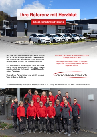 112 meine-region.ch BerufsbildSeit 2004 steht die Carrosserie Spiez AG f%u00fcr Kompetenz in Sachen Autospenglerei und Lackierarbeiten. Das Unternehmen zeichnet sich durch seine hohe Servicequalit%u00e4t, Effi zienz und Professionalit%u00e4t aus.Ein hochmoderner Werkzeugpark samt Richtbank macht rasche Reparaturen m%u00f6glich samt Lackierarbeiten mittels UV-Technologie %u2013 seit 2016 auch f%u00fcr grosse Fahrzeuge. Unternehmer Patrick Balmer und sein 20-k%u00f6pfi ges Team sind gerne f%u00fcr Sie da.Wir bilden Carrossier-Lackierer/innen EFZ und Spengler/innen EFZ aus!Bei Fragen zu offenen Stellen, Schnuppertagen oder zur Ausbildung melden Sie sich ungeniert bei uns.Industriestrasse 24 | 3700 Spiez-Lattigen | 033 654 32 55 | info@carrosserie-spiez.ch | www.carrosserie-spiez.chIhre Referenz mit Herzblutschnell, kompetent und vielseitig