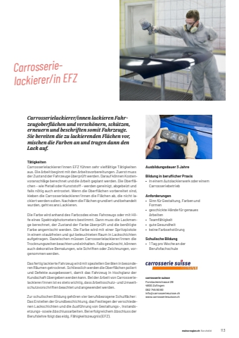 meine-region.ch meine-region.chBerufsbilder Berufsbild 1131Carrosserielackierer/in EFZCarrosserielackierer/innen lackieren Fahrzeugoberfl %u00e4chen und versch%u00f6nern, sch%u00fctzen, erneuern und beschriften somit Fahr zeuge. Sie bereiten die zu lackierenden Fl%u00e4chen vor, mischen die Farben an und tragen dann den Lack auf.T%u00e4tigkeitenCarrosserielackierer/innen EFZ f%u00fchren sehr vielf%u00e4ltige T%u00e4tigkeiten aus. Die Arbeit beginnt mit den Arbeitsvorbereitungen. Zuerst muss der Zustand der Fahrzeuge %u00fcberpr%u00fcft werden. Darauf k%u00f6nnen Kostenvoranschl%u00e4ge berechnet und die Arbeit geplant werden. Die Oberfl %u00e4chen %u2013 wie Metall oder Kunststoff %u2013 werden gereinigt, abgebeizt und falls n%u00f6tig auch entrostet. Wenn die Oberfl %u00e4chen vorbereitet sind, kleben die Carrosserielackierer/innen die Fl%u00e4chen ab, die nicht lackiert werden sollen. Nachdem die Fl%u00e4chen grundiert und behandelt wurden, geht es ans Lackieren.Die Farbe wird anhand des Farbcodes eines Fahrzeugs oder mit Hilfe eines Spektralphotometers bestimmt. Dann muss die Lackmenge berechnet, der Zustand der Farbe %u00fcberpr%u00fcft und die ben%u00f6tigte Farbe angemischt werden. Die Farbe wird mit einer Spritzpistole in einem staubfreien und gut beleuchteten Raum in Lackschichten aufgetragen. Dazwischen m%u00fcssen Carrosserielackierer/innen die Trocknungszeiten beachten und einhalten. Falls gew%u00fcnscht, k%u00f6nnen auch dekorative Bemalungen, wie Schriften oder Zeichnungen, vorgenommen werden.Das fertig lackierte Fahrzeug wird mit speziellen Ger%u00e4ten in besonderen R%u00e4umen getrocknet. Schliesslich werden die Oberfl %u00e4chen poliert und Defekte ausgebessert, damit das Fahrzeug in Hochglanz der Kundschaft %u00fcbergeben werden kann. Bei der Arbeit von Carrosserielackierer/innen ist es stets wichtig, dass Arbeitsschutz- und Umweltschutzvorschriften beachtet und angewendet werden.Zur schulischen Bildung geh%u00f6ren vier berufsbezogene Schulf%u00e4cher: Das Erstellen der Grundbeschichtung, das Festlegen der verschiedenen Lackschichten und die Ausf%u00fchrung von Gestaltungs-, Instandsetzungs- sowie Abschlussarbeiten. Bei erfolgreichem Abschluss der Berufslehre folgt das eidg. F%u00e4higkeitszeugnis (EFZ).carrosserie suisseForstackerstrasse 2B4800%u0009Zofi%u0009ngen062 745 90 80info@carrosseriesuisse.chwww.carrosseriesuisse.chAusbildungsdauer 3 JahreBildung in berufl icher Praxis%u2022 In einem Autolackierwerk oder einem CarrosseriebetriebAnforderungen%u2022 Sinn f%u00fcr Gestaltung, Farben und Formen%u2022 geschickte H%u00e4nde f%u00fcr genaues Arbeiten%u2022 Teamf%u00e4higkeit%u2022 gute Gesundheit%u2022 keine Farbsehst%u00f6rungSchulische Bildung %u2022 1 Tag pro Woche an der BerufsfachschuleSeit 2004 steht die Carrosserie Spiez AG f%u00fcr Kompe,tenz in Sachen Autospenglerei und Lackierarbeiten. Das Unternehmen zeichnet sich durch seine hohe Servicequalit%u00e4t, Effi zienz und Professionalit%u00e4t aus.Ein hochmoderner Werkzeugpark samt Richtbank macht rasche Reparaturen m%u00f6glich samt Lackier,arbeiten mittels UV-Technologie %u2013 seit 2016 auch f%u00fcr grosse Fahrzeuge. Unternehmer Patrick Balmer und sein 20-k%u00f6pfi ges Team sind gerne f%u00fcr Sie da.Wir bilden Carrossier-Lackierer/innen EFZ und Spengler/innen EFZ aus!Bei Fragen zu offenen Stellen, Schnupper,tagen oder zur Ausbildung melden Sie sich ungeniert bei uns.Industriestrasse 24 | 3700 Spiez-Lattigen | 033 654 32 55 | info@carrosserie-spiez.ch | www.carrosserie-spiez.chIhre Referenz mit Herzblutschnell, kompetent und vielseitig
