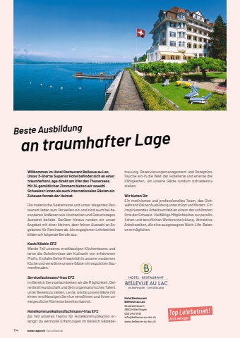 114 meine-region.ch Top Lehrbetrieb meine-region.ch Top Lehrbetriebe 1Hotel Restaurant Bellevue au LacStaatsstrasse 13652%u0009Hilterfi%u0009ngen033 244 51 51info@bellevue-au-lac.chwww.bellevue-au-lac.chBeste Ausbildung an traumhafter LageWillkommen im Hotel Restaurant Bellevue au Lac. Unser 3-Sterne Superior Hotel befi ndet sich an einer traumhaften Lage direkt am Ufer des Thunersees. Mit 34 gem%u00fctlichen Zimmern bieten wir sowohl Schweizer:innen als auch internationalen G%u00e4sten ein Zuhause fernab der Heimat. Die malerische Seeterrasse und unser elegantes Restaurant laden zum Verweilen ein und sind auch bei besonderen Anl%u00e4ssen wie Hochzeiten und Geburtstagen %u00e4usserst beliebt. Dar%u00fcber hinaus runden wir unser Angebot mit einer kleinen, aber feinen Auswahl an Angeboten f%u00fcr Seminare ab. Als engagierter Lehrbetrieb bilden wir folgende Berufe aus:Koch/K%u00f6chin EFZWerde Teil unseres erstklassigen K%u00fcchenteams und lerne die Geheimnisse der Kulinarik von erfahrenen Profi s. Entfalte Deine Kreativit%u00e4t in unserer modernen K%u00fcche und verw%u00f6hne unsere G%u00e4ste mit exquisiten Gaumenfreuden.Servicefachmann/-frau EFZIm Bereich Servicefach bieten wir die M%u00f6glichkeit, Deine Gastfreundschaft und Dein organisatorisches Talent unter Beweis zu stellen. Lerne, wie Du unsere G%u00e4ste mit einem erstklassigen Service verw%u00f6hnen und ihnen unvergessliche Momente bereiten kannst.Hotelkommunikationsfachmann/-frau EFZAls Teil unseres Teams f%u00fcr Hotelkommunikation erlangst Du wertvolle Erfahrungen im Bereich G%u00e4stebetreuung, Reservierungsmanagement und Rezeption. Tauche ein in die Welt der Hotellerie und erlerne die F%u00e4higkeiten, um unsere G%u00e4ste rundum zufriedenzustellen.Wir bieten Dir:Ein motiviertes und professionelles Team, das Dich w%u00e4hrend Deiner Ausbildung unterst%u00fctzt und f%u00f6rdert. Ein inspirierendes Arbeitsumfeld an einem der sch%u00f6nsten Orte der Schweiz. Vielf%u00e4ltige M%u00f6glichkeiten zur pers%u00f6nlichen und berufl ichen Weiterentwicklung. Attraktive Arbeitszeiten, die eine ausgewogene Work-Life-Balance erm%u00f6glichen.