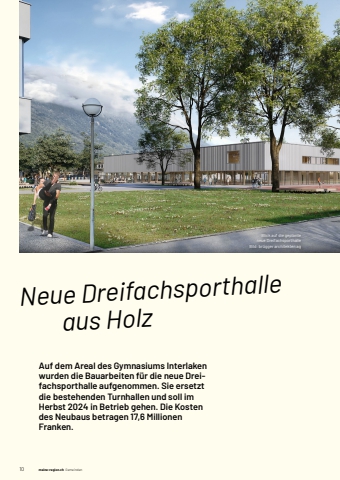 10 meine-region.ch meine-region.ch GemeindenNeue Dreifachsporthalle aus Holz Auf dem Areal des Gymnasiums Interlaken wurden die Bauarbeiten f%u00fcr die neue Dreifachsporthalle aufgenommen. Sie ersetzt die bestehenden Turnhallen und soll im Herbst 2024 in Betrieb gehen. Die Kosten des Neubaus betragen 17,6 Millionen Franken.Blick auf die geplante neue DreifachsporthalleBild: br%u00fcgger architekten ag
