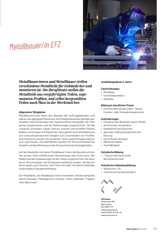 meine-region.ch meine-region.chBerufsbilder Berufsbild 1191Metallbauer/in EFZMetallbauerinnen und Metallbauer stellen verschiedene Metallteile f%u00fcr Geb%u00e4ude her und montieren sie. Die Berufsleute stellen die Metallteile aus vorgefertigten Teilen, sogenannten Profi len, und selbst hergestellten Teilen nach Mass in der Werkstatt her.Allgemeine T%u00e4tigkeitenMetallbauer/innen lesen den Bauplan der Auftraggebenden und w%u00e4hlen das geeignete Metall aus. Die Metallteile werden gem%u00e4ss den Angaben und Zeichnungen des Ingenieurb%u00fcros festgelegt, die Teile genau ausgemessen und die Markierungen angezeichnet. Die Berufsleute schneiden, fr%u00e4sen, bohren, stanzen und schleifen Platten, Balken und Stangen mit Maschinen. Dazu geh%u00f6rt auch die Bedienung von computergesteuerten Anlagen zum Zuschneiden von Profi len. Anschliessend werden die einzelnen Teile zusammengeschweisst und -geschraubt. Die Oberfl %u00e4chen werden mit Rostschutzfarbe behandelt und das Werkzeug sowie die Ausr%u00fcstung instandgehalten.Auf der Baustelle montieren Metallbauer/innen die Bauteile und ziehen grosse Teile mithilfe eines Flaschenzugs oder Krans hoch. Bei Bedarf werden Anpassungen an den Teilen vorgenommen, die dann durch Verschrauben und Schweissen befestigt werden. Die Berufsleute bauen auch Fenster und T%u00fcren ein oder montieren Gel%u00e4nder sowie andere Fassadenelemente.Die Metallteile, die Metallbauer/innen herstellen, k%u00f6nnen beispielsweise Fassaden, Metallger%u00fcste, Fenster, T%u00fcren, Gel%u00e4nder, Treppen oder Z%u00e4une sein. AM SuisseSeestrasse 1058027%u0009Z%u00fcrich%u0009044 285 77 77info@amsuisse.ch www.metall-und-du.chwww.amsuisse.chAusbildungsdauer 4 JahreFachrichtungen%u2022 Metallbau%u2022 Schmiedearbeiten%u2022 StahlbauBildung in berufl icher Praxis%u2022 In einem Betrieb der Stahl-, Metall-, Fenster- oder Fassaden baubrancheAnforderungen%u2022 Freude an der Bearbeitung von Metall%u2022 technisches Verst%u00e4ndnis%u2022 handwerkliches Geschick%u2022 gesunde, kr%u00e4ftige k%u00f6rperliche Verfassung%u2022 keine Metall-Allergien%u2022 Wetterfestigkeit%u2022 Teamf%u00e4higkeitSchulische Bildung %u2022 1 Tag pro Woche an einer Berufs fachschuleSchulische Vollzeitausbildung%u2022 Albisbrunn / ZH%u2022 Technische Fachschule BernDie Firma Brunner AG hat sich auf Industriebau, Metallbau, Spengler- und Abkantarbeiten spezialisiert. Ihr Ziel besteht darin, Dienstleistungen durch Qualit%u00e4t und Termintreue zu vermarkten.Ein Beruf f%u00fcr selbst%u00e4ndige Macher:innenDu bist ein selbst%u00e4ndiger Macher und willst eine konstruktive Zukunft? Dann ist der Beruf Metallbauer/in EFZ genau richtig f%u00fcr Dich. Er bietet Dir verschiedene Fachrichtungen. Du kannst mit deinen eigenen H%u00e4nden etwas erschaff en, seis draussen oder drinnen.Metallbau ist Teamarbeit! Es kommt auf jeden an, damit es gut wird. Bauen mit Metall fasziniert. Am Ende des Tages siehst Du, was Du gemacht hast und manche Werke (be)stehen noch sehr lange.Voraussetzungen als Metallbauer/in EFZ:%u2022 gute Leistungen im Rechnen und Zeichnen %u2022 handwerkliche Begabung%u2022 Begeisterung in der Bearbeitung von Metall%u2022 Freude am KonstruierenBei Fragen steht Dir Herr Niklaus Werren gerne zur Verf%u00fcgung.Wir freuen uns %u00fcber Deine Bewerbung!Ihr Partner in der Metallverarbeitung %u2013 seit 1985Brunner AGBierigutstrasse 1a3608 Thun033 336 00 88info@brunneragthun.chwww.brunneragthun.ch