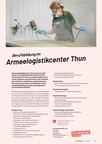 meine-region.ch meine-region.chTop Lehrbetriebe Top Lehrbetrieb 121Armeelogistikcenter ThunSchw%u00e4bis3602 Thun058 485 86 49alc.thun.lba@vtg.admin.chwww.vtg.admin.ch Berufsbildung imArmeelogistikcenter ThunDas Armeelogistikcenter Thun ist eines von f%u00fcnf Centern der Logistikbasis der Armee und unterst%u00fctzt sowohl die Armee im Ausbildungsdienst und in allen Eins%u00e4tzen, als auch Partner:innen und Dritte durch effektive und effi ziente Logistikleistungen. Mit seinen Aussenstellen besch%u00e4ftigt das Center rund 800 Mitarbeitende sowie Auszu bildende in 14%u00a0verschiedenen Berufen.M%u00f6chtest Du spannende Diagnose- und Wartungsarbeiten an Panzer, Nutzfahrzeugen oder Personenwagen durchf%u00fchren? Bist Du interessiert, als Polymechaniker/in hautnah an Arbeiten auf dem Flugplatz Meiringen t%u00e4tig zu sein? Willst Du Textilien in unserem modernen Textilcenter bewirtschaften oder als Logistiker/in eng mit der Truppe zusammenarbeiten? Wir bieten eine Vielzahl an spannenden und abwechslungsreichen Lehrberufen:Standort Thun%u2022 Automobil-Mechatroniker/in EFZ, Fachrichtung Personenwagen und Nutzfahrzeuge%u2022 Fachmann/-frau Betriebsunterhalt EFZ, Fachrichtung Werkdienst%u2022 Fachmann/-frau Leder und Textil EFZ, Fachrichtung Fahrzeug und Technik%u2022 Fachmann/-frau Textilpfl ege EFZ, Fachrichtung W%u00e4scherei%u2022 Forstwart/in EFZ%u2022 Logistiker/in EFZ, Fachrichtung Lager%u2022 Metallbauer/in EFZ%u2022 Schreiner/in EFZ, Fachrichtung Bau/Fenster%u2022 Carrosserielackierer/in EFZ%u2022 Carrosseriespengler/in EFZ%u2022 Strassentransportfachmann/-frau EFZ%u2022 Unterhaltspraktiker/in EBAStandort Bern%u2022 Automobil-Mechatroniker/in EFZ, Fachrichtung Personenwagen und NutzfahrzeugeStandort Brenzikofen%u2022 Logistiker/in EFZ, Fachrichtung LagerStandort Meiringen%u2022 Automobil-Fachmann/frau EFZ, Fachrichtung Personenwagen%u2022 Fachmann/frau Betriebsunterhalt EFZ, Fachrichtung Hausdienst%u2022 Polymechaniker/in EFZStandort Wangen an der Aare%u2022 Fachmann/frau Betriebsunterhalt EFZ, Fachrichtung Werkdienst%u2022 Unterhaltspraktiker/in EBAmeine-region.ch Top Lehrbetriebe 1Elektro Hunziker AGMoosweg 103607 Thun033 225 10 10Bundesrat Adolf Ogi-Strasse 193718 Kandersteg033 675 81 31Thunerstrasse 23A3700 Spiez033 645 96 66info@elektrohunziker.chwww.elektrohunziker.chMach eine Lehre mit Zukunft %u2013 erlerne einen ElektroberufDu bist bald Schulabg%u00e4nger/in, auf der Suche nach einer Lehrstelle und weisst nicht, welchen Beruf Du erlernen sollst? Unsere Fragen bringen Dich weiter:%u2022 Interessierst Du Dich f%u00fcr Strom, Technik und Digitalisierung?%u2022 Bist Du handwerklich begabt und clever? %u2022 Magst Du feinmotorische Arbeiten?%u2022 Bist Du wetterfest?%u2022 Arbeitest Du gerne an unterschiedlichen Orten? %u2022 Bist Du ein Teamplayer?%u2022 Suchst Du eine Arbeitgeberin, bei der Du viel lernst?Wenn Du Dich angesprochen f%u00fchlst, ist ein Beruf in der Welt der Elektrotechnik genau das Richtige f%u00fcr Dich. Als f%u00fchrende Anbieterin von Elektrotechnik-Dienst,leistungen am Bauwerk in der Region Thun begeistern wir uns seit %u00fcber 30 Jahren f%u00fcr die Elektrotechnik und bilden laufend Lernende aus. Bei uns fi ndest Du Lehrstellen als Elektroinstallateur/in EFZ, Montage-Elektriker/in EFZ und Solarinstallateur/in EFZ. Was Du daf%u00fcr brauchst, ist handwerkliches Ge,schick, Kraft und ein schlaues K%u00f6pfchen. Und nach Ab,schluss Deiner Lehre hast Du einen Beruf mit Zukunft. Denn die Digitalisierung braucht Strom und vor allem Fachleute, die sie umsetzen und vorantreiben. Ist pro,grammieren mehr Dein Ding? Als Geb%u00e4udeinformatiker/in EFZ verbindest Du Technik und Informatik.Unsere 80 Mitarbeitenden, davon zw%u00f6lf Lernende, sind %u00fcberzeugte Elektrofachleute, die ihren Beruf mit Stolz und Freude aus%u00fcben. Werde auch Du Teil unseres Teams und schick uns Deine Bewerbung. Wir freuen uns auf Dich!Was Dich bei uns erwartet:%u2022 Tolles Team%u2022 13. Monatslohn%u2022 bezahlte Autopr%u00fcfung%u2022 super LAP-Vorbereitung