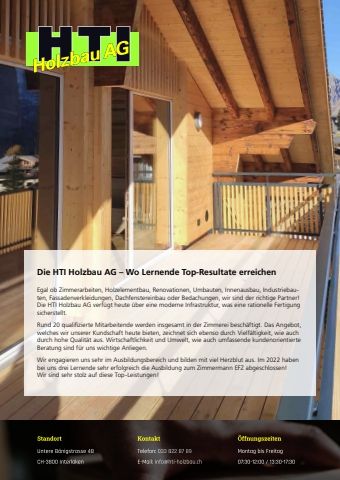 122 meine-region.ch BerufsbildDie HTI Holzbau AG %u2013 Wo Lernende Top-Resultate erreichenEgal ob Zimmerarbeiten, Holzelementbau, Renovationen, Umbauten, Innenausbau, Industriebauten, Fassadenverkleidungen, Dachfenstereinbau oder Bedachungen, wir sind der richtige Partner! Die HTI Holzbau AG verf%u00fcgt heute %u00fcber eine moderne Infrastruktur, was eine rationelle Fertigung sicherstellt. Rund 20 qualifi zierte Mitarbeitende werden insgesamt in der Zimmerei besch%u00e4ftigt. Das Angebot, welches wir unserer Kundschaft heute bieten, zeichnet sich ebenso durch Vielf%u00e4ltigkeit, wie auch durch hohe Qualit%u00e4t aus. Wirtschaftlichkeit und Umwelt, wie auch umfassende kundenorientierte Beratung sind f%u00fcr uns wichtige Anliegen.Wir engagieren uns sehr im Ausbildungsbereich und bilden mit viel Herzblut aus. Im 2022 haben bei uns drei Lernende sehr erfolgreich die Ausbildung zum Zimmermann EFZ abgeschlossen! Wir sind sehr stolz auf diese Top-Leistungen!