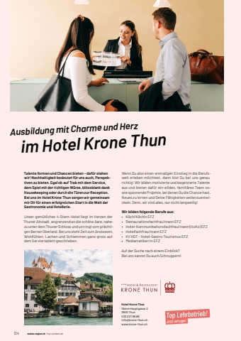 124 meine-region.ch Top Lehrbetrieb meine-region.ch Top Lehrbetriebe 1Hotel Krone ThunObere Hauptgasse 23600 Thun033 227 88 88info@krone-thun.chwww.krone-thun.chAusbildung mit Charme und Herz im Hotel Krone ThunTalente formen und Chancen bieten %u2013 daf%u00fcr stehen wir! Nachhaltigkeit bedeutet f%u00fcr uns auch, Perspektiven zu bieten. Egal ob auf Trab mit dem Service, dem Spiel mit der richtigen W%u00fcrze, blitzeblank dank Housekeeping oder durch die T%u00fcren zur Reception. Bei uns im Hotel Krone Thun sorgen wir gemeinsam mir Dir f%u00fcr einen erfolg reichen Start in die Welt der Gastronomie und Hotellerie.Unser gem%u00fctliches 4-Stern-Hotel liegt im Herzen der Thuner Altstadt, angrenzend an die sch%u00f6ne Aare, nahezu unter dem Thuner Schloss und umringt vom pr%u00e4chtigen Berner Oberland. Bei uns steht Zeit zum Anstossen, Wohlf%u00fchlen, Lachen und Schlemmen ganz gross auf dem Serviertablett geschrieben.Wenn Du also einen einmaligen Einstieg in die Berufswelt erleben m%u00f6chtest, dann bist Du bei uns genau richtig! Wir bilden motivierte und begeisterte Talente aus und bieten daf%u00fcr ein wildes, famili%u00e4res Team sowie spannende Projekte, bei denen Du die Chance hast, Neues zu lernen und Deine F%u00e4higkeiten weiterzuentwickeln. Denn, wir sind alles, nur nicht langweilig!Wir bilden folgende Berufe aus:%u2022 K%u00f6ch/K%u00f6chin EFZ%u2022 Restaurationsfachfrau/mann EFZ%u2022 Hotel-Kommunikationsfachfrau/mann (HoKo) EFZ%u2022 Hotelfachfrau/mann EFZ%u2022 KV HGT %u2013 Hotel-Gastro-Tourismus EFZ%u2022 Mediamatiker/in EFZAuf der Suche nach einem Einblick?Bei uns kannst Du auch Schnuppern!
