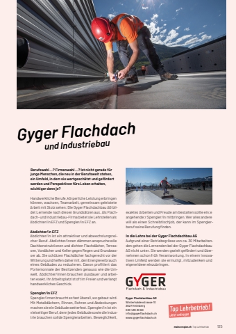 meine-region.ch meine-region.ch Top Lehrbetrieb Top Lehrbetriebe 125 1Gyger Flachdachbau AGWinterhaldenstrasse%u0009103627 Heimberg033 439 30 60info@gygerfl%u0009achdach.chwww.gygerfl%u0009achdach.chGyger Flachdach und IndustriebauBerufswahl %u2026? Firmenwahl %u2026? Ist nicht gerade f%u00fcr junge Menschen, die neu in der Berufswelt stehen, ein Umfeld, in dem sie wertgesch%u00e4tzt und gef%u00f6rdert werden und Perspektiven f%u00fcrs Leben erhalten, wichtiger denn je?Handwerkliche Berufe, k%u00f6rperliche Leistung erbringen k%u00f6nnen, wachsen, Team arbeit, gemeinsam geleistete Arbeit mit Stolz sehen: Die Gyger Flachdachbau AG bildet Lernende nach diesen Grunds%u00e4tzen aus. Als Flachdach- und Industriebau-Firma bietet sie Lehrstellen als Abdichter/in EFZ und Spengler/in EFZ an.Abdichter/in EFZAbdichter/in ist ein attraktiver und abwechslungsreicher Beruf. Abdichter/innen d%u00e4mmen anspruchsvolle Dachkonstruktionen und dichten Flachd%u00e4cher, Terrassen, Vord%u00e4cher und Keller gegen Regen und Grundwasser ab. Sie sch%u00fctzen Flachd%u00e4cher fachgerecht vor der Witterung und helfen daher mit, den Energieverbrauch eines Geb%u00e4udes zu reduzieren. Davon profi tiert das Portemonnaie der Besitzenden genauso wie die Umwelt. Abdichter/innen brauchen Ausdauer und arbeiten exakt. Ihr Arbeitsplatz ist oft im Freien und verlangt handwerkliches Geschick.Spengler/in EFZSpengler/innen braucht es fast %u00fcberall, wo gebaut wird. Mit Metalld%u00e4chern, Rinnen, Rohren und Abdeckungen machen sie ein Geb%u00e4ude wetterfest. Spengler/in ist ein vielseitiger Beruf, denn jedes Geb%u00e4ude sowie die Industrie brauchen solide Spenglerarbeiten. Beweglichkeit, exaktes Arbeiten und Freude am Gestalten sollte ein:e angehende:r Spengler/in mitbringen. Wer alles andere will als einen Schreibtischjob, der kann im Spenglerberuf seine Berufung fi nden.In die Lehre bei der Gyger Flachdachbau AGAufgrund einer Betriebsgr%u00f6sse von ca. 30 Mitarbeitenden gehen die Lernenden bei der Gyger Flachdachbau AG nicht unter. Sie werden gezielt gef%u00f6rdert und %u00fcbernehmen schon fr%u00fch Verantwortung. In einem innovativen Umfeld werden sie ermutigt, mitzudenken und eigene Ideen einzubringen.