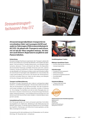 meine-region.ch meine-region.chBerufsbilder Berufsbild 1271Strassentransportfachmann/-frau EFZStrassentransportfachleute transportieren verschiedene G%u00fcter mit Laswagen (LKW) und anderen Fahrzeugen (F%u00fchrerausweiskategorie B/C/CE). Sie planen die Transporte und wissen, wie sie mit der Ware umgehen m%u00fcssen. Sie k%u00f6nnen auch kleinere Reparaturen ausf%u00fchren und Pannen beheben.VorbereitungStrassentransportfachleute organisieren den Transport, planen die Route und sch%u00e4tzen ab, wie lange das Beladen und Entladen der Ware dauert. Sie kontrollieren Transportdokumente, zum Beispiel Zolldokumente, Adressen, Fristen und Gewicht der Ware. Sie %u00fcberpr%u00fcfen den Zustand des Fahrzeugs, wie R%u00e4der, Bremsen und Licht, und kontrollieren, ob genug Treibstoff im Tank ist. Ebenfalls beaufsichtigen sie das Beladen von Fahrzeug mit Ware und je nach Situation helfen sie manchmal mit Hubstapler oder Hebeb%u00fchne mit. Sie verteilen die Lasten gleichm%u00e4ssig und sinnvoll. Sie kennen die Sicherheitsvorschriften und halten diese ein, indem sie die Ladung, zum Beispiel mit Gurten, Stangen oder Netzen sichern.Transport und WarenlieferungSie fahren mit dem Fahrzeug an den Lieferort und beachten dabei Verkehrs- und Wetterbedingungen. Sie benutzen elektronische Ger%u00e4te wie Routen planer und Fahrtenschreiber. Bei den Kundinnen und Kunden entladen sie die Ware und pr%u00fcfen, ob alles in Ordnung ist. Sie erledigen Formalit%u00e4ten wie die korrekte %u00dcbergabe des Lieferscheins inkulsive Unterzeichnung. Strassentransportfachleute halten Arbeitssicherheits- und Um welt schutz vorschriften ein und kennen auch die Vor schriften in den L%u00e4ndern, in die die Waren transportiert werden.Instandhaltung FahrzeugeDie Fahrzeuge werden von innen und aussen gereinigt, Kontrollen durchgef%u00fchrt (z. B. Elektro nik, Reifendruck oder Beleuchtung) und defekte Teile ersetzt. Es werden kleinere Reparaturen an Fahrzeugen durchgef%u00fchrt, Werkzeuge und Hilfsmittel instand gehalten und Abf%u00e4lle umweltgerecht entsorgt.Voraussetzung f%u00fcr die Ausbildung ist ein Mindestalter von 16 Jahren (Stichtag: 30. November des 1. Lehrjahres).ASTAG Schweizerischer NutzfahrzeugverbandW%u00f6lfl%u0009istrasse%u000953006 Bern 076 351 28 35profi%u0009s-on-tour@astag.chwww.profi%u0009s-on-tour.chAusbildungsdauer 3 JahreBildung in berufl icher Praxis%u2022 In einem Betrieb des StrassentransportgewerbesAnforderungen%u2022 Freude am Unterwegssein%u2022 Selbstst%u00e4ndigkeit%u2022 Verantwortungsbewusstsein%u2022 Zuverl%u00e4ssigkeit%u2022 DiskretionSchulische Bildung %u2022 1 Tag pro Woche an der Berufs fachschuleSeematter AG | Im Moos 3 | Postfach 738 | 3802 InterlakenB%u00fcro 033 827 99 37 | Dispo 079 656 24 24 | www.seematterag.chZur richtigen Zeit am richtigen OrtSeematter AG transportiert Ger%u00e4te, Maschinen und Bagger, aber auch Humus, Kies, Steine und Re,cyclingmaterial. F%u00fcr jeden Transport verf%u00fcgen wir %u00fcber das geeignete Transportmittel. Wir bringen das auf die Baustelle, was gerade gebraucht wird. Mit pers%u00f6nlichem Engagement und langj%u00e4hriger Erfahrung setzen wir uns daf%u00fcr ein, die Infrastruk,tur in der Region zu erhalten und nachhaltig auszubauen. So leisten wir einen erheblichen Beitrag zu einem attraktiven Lebens- und Arbeitsraum.Dank motivierten und spezialisierten Mitarbeitenden, einem umfassenden Fuhr- und Maschinen,park sowie unserer eigenen Deponie und Wiederaufbereitungsanlage sind wir der richtige Partner.Mit Freude engagieren wir uns im Bereich Ausbildung und suchen Dich:Chauffeur/in EFZ