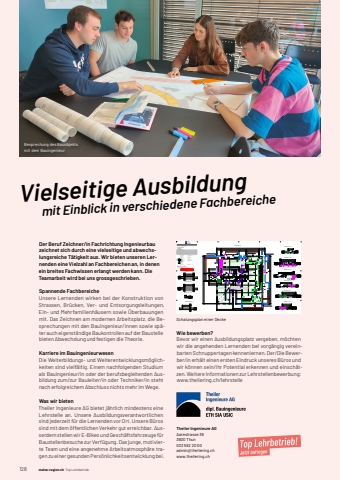 128 meine-region.ch Top Lehrbetrieb meine-region.ch Top Lehrbetriebe 1Theiler Ingenieure AGAarestrasse 363600 Thun033 552 20 00admin@theilering.chwww.theilering.chDer Beruf Zeichner/in Fachrichtung Ingenieurbau zeichnet sich durch eine vielseitige und abwechslungsreiche T%u00e4tigkeit aus. Wir bieten unseren Lernenden eine Vielzahl an Fachbereichen an, in denen ein breites Fachwissen erlangt werden kann. Die Teamarbeit wird bei uns grossgeschrieben.Spannende FachbereicheUnsere Lernenden wirken bei der Konstruktion von Strassen, Br%u00fccken, Ver- und Entsorgungsleitungen, Ein- und Mehrfamilienh%u00e4usern sowie %u00dcberbauungen mit. Das Zeichnen am modernen Arbeitsplatz, die Besprechungen mit den Bauingenieur/innen sowie sp%u00e4ter auch eigenst%u00e4ndige Baukontrollen auf der Baustelle bieten Abwechslung und festigen die Theorie. Karriere im BauingenieurwesenDie Weiterbildungs- und Weiterentwicklungsm%u00f6glichkeiten sind vielf%u00e4ltig. Einem nachfolgenden Studium als Bauingenieur/in oder der berufsbegleitenden Ausbildung zum/zur Bauleiter/in oder Techniker/in steht nach erfolgreichem Abschluss nichts mehr im Wege.Was wir bietenTheiler Ingenieure AG bietet j%u00e4hrlich mindestens eine Lehrstelle an. Unsere Ausbildungsverantwortlichen sind jederzeit f%u00fcr die Lernenden vor Ort. Unsere B%u00fcros sind mit dem %u00f6ffentlichen Verkehr gut erreichbar. Ausserdem stellen wir E-Bikes und Gesch%u00e4ftsfahrzeuge f%u00fcr Baustellenbesuche zur Verf%u00fcgung. Das junge, motivierte Team und eine angenehme Arbeitsatmosph%u00e4re tra,gen zu einer gesunden Pers%u00f6nlichkeitsentwicklung bei.Wie bewerben?Bevor wir einen Ausbildungsplatz vergeben, m%u00f6chten wir die angehenden Lernenden bei vorg%u00e4ngig vereinbarten Schnuppertagen kennenlernen. Der/Die Bewerber/in erh%u00e4lt einen ersten Eindruck unseres B%u00fcros und wir k%u00f6nnen sein/ihr Potential erkennen und einsch%u00e4tzen. Weitere Informationen zur Lehrstellenbewerbung: www.theilering.ch/lehrstelleVielseitige Ausbildung mit Einblick in verschiedene FachbereicheBesprechung des Bauobjekts mit dem BauingenieurDecke d=30cmUK roh: +2.51 / OK roh: +2.81Decke d=30cmUK roh: +2.51 / OK roh: +2.81UK roh: +2.57 / OK roh: +2.92 %u00f7 +2.84Balkon d=24cm %u00f7 34cmUK roh: +2.57 %u00f7 +2.51 / OK roh: +2.85 %u00f7 +2.81B BA AC CF FG GDD 15/40DD 20/20DD 20/40 DD 20/20 DD 20/20DD 20/20DD 20/35 DD 20/20DD 20/35DD 20/20DD 20/20DD 20/20DD 20/35DD 15/35DD 15/35DD 68/25 DD 20/20 DD 20/20DD 15/35DD 15/35DD 40/50D DOK 1.1%OK 1.7%OK 1.7%OK 2.1%OK 1.6%OK : +2.81OK : +2.81OK : +2.92OK : +2.82ARBO-430-08-S3-CO50-CU50 E3 St%u00fcckBalkon d=24cm %u00f7 34cmUK roh: +2.51 %u00f7 +2.57 / OK roh: 2.85 %u00f7 2.81ARBO-430-08-S3-CO50-CU50 E2 St%u00fcckDD 30/25DD 68/25DD 20/20OK 2.7%24.3124.1723.13524.0853.6158.16 4.44 10.53511.41 3.87 8.7951.0452.605 4.805.1320 4.73 202.40 2.301.60 25 552.64513 3.746.58 3.8759.04 8 57.505 5.8454.863.395 7.4054.78 8 8 4.727.67 81.485 6 1.293.615 6 20785 6 203.603.35 259.16 6.406.43 1.10 30 1.339 92 96.04 8 7.58 25 1.65 25 9.238.35 1.10 11.662.15 6.20 9 92 91.5016 73 161.50 37 245 245 245 37 751.50285 165 165 165 37425 29 41578 655 135 51 655 655 655 655 655 655 53335 13 13 25557 57 57 57 6958.13 6.63 4.65 25 1.575 1.475 2511.245 251.835 50 2518.68 2516.208 785 6 20OK : +2.81OK : +2.855.43 2.1526 1.89115OK : +2.81UK : +2.5725 25 385 26 26 26 26 26 26 385OK : +2.81 UK : +2.57 34 215 215 215 34 356.76 20 6.22 5 2020 6 1.8957.4840 1.00 365 24 24 24 24 24 24 24 24 24 24 24 36520 6 2.345OK : +2.81 UK : +2.57OK : +2.81OK : +2.81 UK : +2.57OK : +2.81 UK : +2.57 OK : +2.81 UK : +2.57OK : +2.81 UK : +2.57192 Stk. CRET-10/20-3002 Stk. CRET-V20/20-1701.655 3.88 25 25 5125 2.35 13 8 4.0314 655 1453.34 552.59 551.195 9518 9 11 5 1515 18515 5 5 14695OK Gef.OK Gef.1OK : +2.92OK : +2.84OK : +2.921cm Dilafuge1cm DilafugeBretteinlage 6 x 3cmOK: +2.81Bretteinlage 6 x 3cmOK:+2.81315 19 19 19 19 19 315 24 24 24 24 24 365 155 20OK : +2.853 Stk. CRET-10/20-3003 Stk. CRET-V20/20-170OK : +2.851cm Dilafuge3.973.89 824 3.656.043.885 2.1556.71586.465OK : +2.66 OK : +2.81 20OK : +2.66 OK : +2.816.422.07OK 5%10 152071 2.49 1.61 3.04 1.32 4.792068 25 68OK : +2.9217 3.57H HSchalungs%u00fcberh%u00f6hung: 0mm Schalungs%u00fcberh%u00f6hung: 10mmSchalungs%u00fcberh%u00f6hung: 0mmSchalungs%u00fcberh%u00f6hung: 10mm Schalungs%u00fcberh%u00f6hung: 20mmBretteinlage 6 x 3cmOK: +2.81Bretteinlage 6 x 3cmOK: +2.81Spriessung min. 8 Wochen stehen lassenSpriessung min. 8 Wochen stehen lassenSpriessung min. 8 Wochen stehen lassenSpriessung min. 8 Wochen stehen lassenUK 2.1%UK 5.7%UK 2.8%OK 2.1%UK 2.8%UK 2.3%UK 1.5%2 Stk. CRET-10/20-3002 Stk. CRET-V20/20-17025UK 2.1%OK 2.7%UK 2.1%2 Stk. CRET-10/20-3002 Stk. CRET-V20/20-1701cm DilafugeOK : +2.85UK roh: +2.57 %u00f7 +2.51 / OK roh: 2.85 %u00f7 2.81UK roh: +2.57 %u00f7 +2.51 / OK roh: 2.85 %u00f7 2.81E EBretteinlage 6 x 3cmOK : +2.818.16 4.44 6.58 8 3.8754.355 8582.155 8 19.16 8 2.83512.66 6.50UK : +2.51 UK : +2.51OK : +2.81 UK : +2.57UK : +2.51Balkon d=24cm %u00f7 34cm Balkon d=24cm %u00f7 34cmBalkon d=27cm %u00f735cmUK : +2.51OK : +2.85Spriessung min. 8 Wochen stehen lassenARBO-430-08-S3-CO30-CU3016 St%u00fcckARBO-430-08-S3-CO50-CU507 St%u00fcckARBO-430-08-S3-CO50-CU505 St%u00fcck ARBO-430-08-S3-CO50-CU507 St%u00fcckARBO-430-08-S2-CO30-CU302 St%u00fcckARBO-430-08-T3-CO30-CU304 St%u00fcckARBO-430-08-T3-CO30-CU304 St%u00fcckARBO-430-08-S3-CO45-CU30 D-D3 St%u00fcckARBO-430-08-U3-CO50-CU502 St%u00fcckARBO-430-08-S3-CO30-CU306 St%u00fcckARBO-430-08-S3-CO30-CU3019 St%u00fcckARBO-430-08-S3-CO30-CU303 St%u00fcck 2 Hilti Hac-30 68/1300 F 2 Hilti Hac-30 68/1050 F 2 Hilti Hac-30 68/1300 F 2 Hilti Hac-30 68/1550 F 2 Hilti Hac-30 68/3050 F 2 Hilti Hac-30 68/3050 F 2 Hilti Hac-30 68/1550 F 2 Hilti Hac-30 68/1550 F 2 Hilti Hac-30 68/3050 F 2 Hilti Hac-30 68/3050 F 2 Hilti Hac-30 68/3050 F 2 Hilti Hac-30 68/1050 F 2 Hilti Hac-30 68/3050 F 2 Hilti Hac-30 68/3050 F 2 Hilti Hac-30 68/3050 F 2 Hilti Hac-30 68/3050 F 2 Hilti Hac-30 68/3050 F 2 Hi