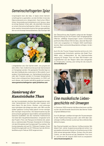 142 meine-region.ch meine-region.ch GemeindenGemeinschaftsgarten SpiezUrspr%u00fcnglich kam die Idee, in Spiez einen Gemeinschaftsgarten zu gestalten, von den Sch%u00fcler:innen des Oberstufenzentrums L%u00e4ngenstein. Nach einer %u00f6ffentlichen Veranstaltung kristalisierte sich heraus, dass es einige Spiezer:innen gibt, die ebenfalls Interesse an einem Gemeinschaftsgarten h%u00e4tten. So wurde an einer zweiten Veranstaltung eine Kerngruppe gebildet, die nun ein Konzept herausarbeitete. Das Konzept h%u00e4lt Leitgedanken wie %u00abDer Garten steht, von jung bis alt, allen offen%u00bb fest. Endlich konnte auch der Gartenstandort festgelegt werden: Die geeignete Parzelle liegt neben dem Geb%u00e4ude des Judoclubs im D%u00fcrrenb%u00fchl. Auch andere Entscheidungen zur Gartenbewirtschaftung oder den Finanzen wurden im Konzept festgehalten. Nach einer erfolgreichen Gartensaison im 2022 soll auch dieses Jahr wieder tatkr%u00e4ftig geg%u00e4rtnert werden. www.gemeinschaftsgarten-spiez.jimdofree.comSanierung der Kunsteisbahn Thun Auf der Kunsteisbahn drehten Sportbegeisterte mehrerer Generationen ihre Runden oder massen sich beim Spiel. F%u00fcr den Schul-, Breiten- und Leistungssport gen%u00fcgten die Anlage aus dem Jahr 1954 und die sp%u00e4ter gebaute Curling-Halle jedoch immer weniger den heutigen Anspr%u00fcchen. Die Gesamtsanierung der zentrumsnah gelegenen Sportst%u00e4tte soll bestehende bauliche Qualit%u00e4ten wie die markante Holzkonstruktion %u00fcber dem Hauptfeld einbeziehen. Umgesetzt wird das Projekt %u00abPolo%u00bb der Marques Architekten AG, wobei die zu realisierenden Minergie-Standards im Einklang mit den Klimazielen der Energiestadt Thun stehen. Die Kosten belaufen sich auf 22,1 Millionen Franken. Einen Verpfl ichtungskredit von 6,7 Millionen hat die Stimmbev%u00f6lkerung im Februar 2022 angenommen. Die %u00dcberpr%u00fcfung des Projekts aufgrund der Budget%u00fcberschreitung von 20 Prozent nach eingegangenen Offerten, allf%u00e4llige Anpassungen sowie notwendige politische Beschl%u00fcsse f%u00fchrten dazu, dass der Baustart nicht wie vorgesehen im Fr%u00fchjahr 2023 stattfi nden konnte. Wann und ob die Bauarbeiten erfolgen, ist derzeit unklar.Auch f%u00fcr die Thuner Eissportvereine wird es ein richtungsweisender Entscheid, welchen die Stadt Thun f%u00e4llen wird. Insbesondere f%u00fcr die Nachwuchsbewegung HC Dragon Thun mit %u00fcber 300 Kindern und Jugendlichen aus der Region w%u00e4re eine zeitgem%u00e4sse Infrastruktur wichtig und richtig f%u00fcr die Zukunft. www.ehcthun.chEine musikalische Liebesgeschichte mit UmwegenIm Sommer 2023 erwartet die Besucherinnen und Besucher die ber%u00fchrende Geschichte des Berner Stadtoriginals D%u00e4llebach Kari.Zum 20-j%u00e4hrigen Jubil%u00e4um bringen die Thunerseespiele den Publikumserfolg aus dem Jahr 2010 %u00fcber den witzigen Coiffeurmeister zur%u00fcck auf die sch%u00f6nste Seeb%u00fchne Europas.Das Musical handelt vom Berner Coiffeurmeister D%u00e4llebach Kari, seiner Ausgrenzung aufgrund seiner Lippenspalte und seinem Kampf um Anerkennung mit der Hilfe seines beissenden Witzes. Sichern Sie sich jetzt Tickets, um das Musical auf der Seeb%u00fchne Thun vom 12. Juli bis zum 26. August 2023 nicht zu verpassen!www.thunerseespiele.ch