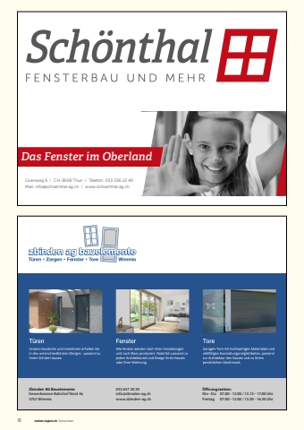 16 meine-region.ch GemeindenGrienweg 6 / CH-3608 Thun / Telefon: 033 336 22 40Mail: info@schoenthal-ag.ch / www.schoenthal-ag.chDas Fenster im OberlandZbinden AG BauelementeGewerbezone Bahnhof Nord 4a 3752 Wimmis 033 657 20 20info@zbinden-ag.chwww.zbinden-ag.ch%u00d6ff nungszeiten: Mo %u2013 Do 07.00 %u2013 12.00 / 13.15 %u2013 17.00 UhrFreitag 07.00 %u2013 12.00 / 13.30 - 16.30 Uhr