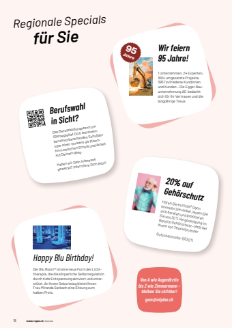 18 meine-region.ch SpecialsRegionale Specials f%u00fcr Sie1 meine-region.ch Von A wie Augen%u00e4rztin bis Z wie Zimmermann %u2013 bleiben Sie sichtbar! gvm@miplan.chBerufswahl in Sicht?Das Berufsbildungszentrum IDM begleitet Dich bei einem berufsvorbereitenden Schuljahr oder einer Vorlehre als Mischform zwischen Schule und Arbeit auf Deinem Weg.Haben wir Dein Interesse geweckt? Informiere Dich jetzt!Wir feiern95 Jahre!1 Unternehmen, 24 Experten, 1804 umgesetzte Projekte, 3957 zufriedene Kundinnen und Kunden %u2013 Die Egger Bauunternehmung AG bedankt sich f%u00fcr Ihr Vertrauen und die langj %u00e4hrige Treue. 20% auf Geh%u00f6rschutzH%u00f6ren Sie es nicht? Dann kommen Sie vorbei, lassen Sie sich beraten und profi tieren Sie von 20% Verg%u00fcnstigung im Bereich Geh%u00f6rschutz %u2013 jetzt bei Ihrem von 7thal H%u00f6rcenterGutscheincode: GS20%Happy Blu Birthday! Der Blu Room%u00ae ist eine neue Form der Lichttherapie, die die k%u00f6rperliche Selbstregulation durch tiefe Entspannung aktiviert und unterst%u00fctzt. An Ihrem Geburtstag bietet Ihnen Frau Miranda Sarbach eine Sitzung zum halben Preis.95 Jahre