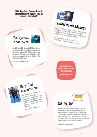 meine-region.ch Specials 19Regionale Specials f%u00fcr Sie1 meine-region.ch SpecialsVon A wie Augen%u00e4rztin bis Z wie Zimmermann %u2013 bleiben Sie sichtbar! gvm@miplan.chBerufswahl in Sicht?Das Berufsbildungszentrum IDM begleitet Dich bei einem berufsvorbereitenden Schuljahr oder einer Vorlehre als Misch,form zwischen Schule und Arbeit auf Deinem Weg.Haben wir Dein Interesse geweckt? Informiere Dich jetzt!Wir feiern95 Jahre!1 Unternehmen, 24 Experten, 1804 umgesetzte Projekte, 3957 zufriedene Kundinnen und Kunden %u2013 Die Egger Bau,unternehmung AG bedankt sich f%u00fcr Ihr Vertrauen und die langj %u00e4hrige Treue. 20% auf Geh%u00f6rschutzH%u00f6ren Sie es nicht? Dann kommen Sie vorbei, lassen Sie sich beraten und profi tieren Sie von 20% Verg%u00fcnstigung im Bereich Geh%u00f6rschutz %u2013 jetzt bei Ihrem von 7thal H%u00f6rcenterGutscheincode: GS20%Happy Blu Birthday! Der Blu Room%u00ae ist eine neue Form der Licht,therapie, die die k%u00f6rperliche Selbstregulation durch tiefe Entspannung aktiviert und unter,st%u00fctzt. An Ihrem Geburtstag bietet Ihnen Frau Miranda Sarbach eine Sitzung zum halben Preis.95 Jahremeine-region.ch Specials 2Sie m%u00f6chten auch Teil des Magazins sein?Wir freuen uns!gvm@miplan.chTolle Angebote, Rabatte, Vorteile und Ideen in Ihrer Region %u2013 nur f%u00fcr unsere Leserschaft! Toi, Toi, ToiWintersport im Schneegest%u00f6ber, frostige Rivalit%u00e4ten, warmherzige Charaktere: Das neuste Projekt %u00abVogellisi und der K%u00f6nig der L%u00fcfte%u00bb ist ein nostalgisches Winterm%u00e4rchen voller Magie. Vom 8. Dezember 2023 bis zum 20. Januar 2024 k%u00f6nnen Sie das neu inszenierte Theaterst%u00fcck im KK Thun geniessen.www.maerchenhaft.chMuay Thai kennenlernen?Bei uns sind alle willkommen, die sich f%u00fcr Sport und ein faires Miteinander begeistern. Im November 2023 feiern wir unser 25-j%u00e4hriges Bestehen. Komm vorbei und lerne uns kennen!www.black-dragon.chMusikgenuss in der BuchtAm 25. und 26. August 2023 werden in der sch%u00f6nen Bucht von Spiez einzigartige Stimmen, grossartige Gitarrensolos und ein bunter Mix aus internationalen Musiker:innen anzutreffen sein. Sichern Sie sich jetzt die Tickets!www.seasidefestival.chFindest du die L%u00f6sung?1110111 1110111 1110111 101110 1110000 1100011 1100101 1110100 1100101 1110010 1100001 101110 1100011 1101000 101111 1101001 1101110 1100110 1101111 1110010 1101101 1100001 1110100 1101001 1101011Mach mit und lass Dich %u00fcberraschen!Ihr PCETERA Informatik Team (Seite 105)