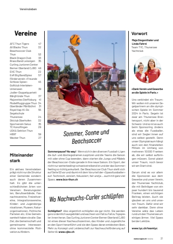 meine-region.ch meine-region.ch Vereine 21VereinslebenVereineSommerpause? No way! Wenn sich in den diversen Fussball-Ligen die Auf- und Abstiegsdramen zuspitzen und die Teams die Saison mit oder ohne Cup beenden, dann starten die Jungs und M%u00e4dels der Beachsoccer-Clubs gerade in ihre neue Saison. Ein Sport, der nicht nur wetterbedingt schweisstreibend ist und der das Sommerfeeling so richtig ankurbelt. Der Beachsoccer Club Thun stellt sich auf Seite 53 vor und r%u00e4umt mit dem Vorurteil der %u00abSpassfussballer%u00bb auf. Technisch, versiert, fokussiert, fair und ja %u2026 auch mit ganz viel Spass. www.bcs-thun.chSchl%u00fcpfen? Also eigentlich schl%u00fcpfen sie gar nicht. Sie werden ganz ordentlich ausgebildet und wachsen von Fall zu Fall zu Topspieler:innen heran. Das Curling Junioren Center Berner Oberland CJBO ist eines dieser Nachwuchszentren, das Kinder und Jugendliche an den Sport heranf%u00fchrt und sie den Spass daran entdecken l%u00e4sst. Mehr zu Konzept und Leidenschaft zur Nachwuchsf%u00f6rderung auf Seite 49. www.cjbo.chVorwortMaja Siegenthaler und Linda FahrniTeam TYC, Thunersee Yachtclub%u00abDank Verein und Gewerbe an die Spiele in Paris.%u00bbUns verbindet ein Traum: Wir wollen mit unseren Segelpartnern an die olympischen Spiele im Sommer 2024 in Paris. Segeln ist zwar am Thunersee Breitensport, nicht aber in der Schweiz. Und so ist es auch beim Sponsoring. Anders als etwa die Fussballer, sind wir Segler:innen auf uns selbst gestellt. Denn unser Olympiatraum h%u00e4ngt auch von den fi nanziellen Mitteln im Umfang von mehreren 10 000 Franken ab, die wir selbst aufbringen m%u00fcssen. Sonst platzt unser Traum, noch bevor wir am Start sind. Darum sind es vor allem die Sponsoren aus dem Gewerbe und unser Verein, der Thunersee Yachtclub, die mit Beitr%u00e4gen von ein paar hundert bis tausend Franken, einen wichtigen Beitrag leisten. Auch sie glauben an uns und unseren Traum. Daf%u00fcr sind wir sehr dankbar. Denn ohne Vereine w%u00e4re das Leben rund um den Thunersee um einiges %u00e4rmer. Viel Spass bei der Lekt%u00fcre.www.tyc.ch/teamtycSommer, Sonne und BeachsoccerWo Nachwuchs-Curler schl%u00fcpfenAFC Thun Tigers 47All Blacks Thun 32Beachsoccer Club Thun 53Black Dragon Club 33Brass Band Leissigen 35Curling Junioren Center Berner Oberland CJBO 49EHC Thun 22EvR Big BandSpiez 57F%u00f6rderverein %u00abFreunde Schloss Spiez%u00bb 45Golfclub InterlakenUnterseen 39Jodler-Doppelquartett B%u00e4rgfr%u00fcnde Thun 37Majorettes Steffi sburg 41Modell fl uggruppe Thun 34Oberl%u00e4nder M%u00e4rlib%u00fchni 31Royal Hap-Ki-Do 55Segelschule Thunersee 24Skiclub Oberhofen 32Sportverein Satus 35TC Konolfi ngen 29USKA Sektion Thun HB9T 59Wacker Thun 27Miteinander starkEin aktives Vereinsleben pr%u00e4gt nicht nur die Struktur einer Gemeinde sondern auch deren Zusammenhalt. Es gibt die unterschiedlichsten Arten von Vereinen: Beratungsstellen, Berufsverb%u00e4nde, Fasnachtsvereine, Freizeitvereine, Integrationsvereine, Kinder- und Jugendorganisationen, Museen, Naturorganisationen, Politische Parteien etc. Eine Gemeinsamkeit haben sie alle: Das Ziel, die Gemeinschaft und gemeinsame Interessen ohne kommerzielle Motivation zu f%u00f6rdern.DAS KOMPLETTE VEREINSVERZEICHNISder Region finden Sie auf unserem Onlineportal www.golocal.swissSCHAUEN SIE JETZT VORBEI!Miplan AG | Fabrikstrasse 10 | 4614 H%u00e4gendorf | Tel. +41 62 210 10 10 | info@miplan.ch | www.miplan.ch | www.golocal.swiss