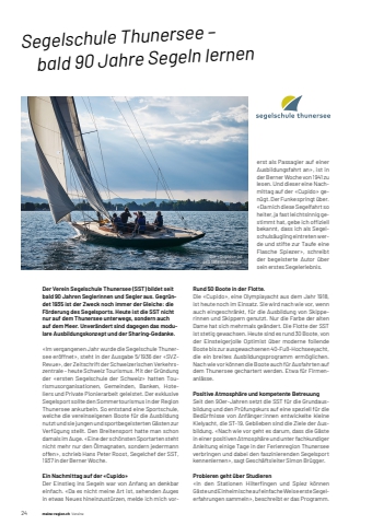 241 meine-region.ch meine-region.ch VereineSegelschule Thunersee %u2013 bald 90 Jahre Segeln lernenDer Verein Segelschule Thunersee (SST) bildet seit bald 90 Jahren Seglerinnen und Segler aus. Gegr%u00fcndet 1935 ist der Zweck noch immer der Gleiche: die F%u00f6rderung des Segelsports. Heute ist die SST nicht nur auf dem Thunersee unterwegs, sondern auch auf dem Meer. Unver%u00e4ndert sind dagegen das modulare Ausbildungskonzept und der Sharing-Gedanke.%u00abIm vergangenen Jahr wurde die Segelschule Thunersee er%u00f6ffnet%u00bb, steht in der Ausgabe 5/1936 der %u00abSVZRevue%u00bb, der Zeitschrift der Schweizerischen Verkehrszentrale %u2013 heute Schweiz Tourismus. Mit der Gr%u00fcndung der %u00abersten Segelschule der Schweiz%u00bb hatten Tourismusorganisationen, Gemeinden, Banken, Hoteliers und Private Pionierarbeit geleistet. Der exklusive Segelsport sollte den Sommertourismus in der Region Thunersee ankurbeln. So entstand eine Sportschule, welche die vereinseigenen Boote f%u00fcr die Ausbildung nutzt und sie jungen und sportbegeisterten G%u00e4sten zur Verf%u00fcgung stellt. Den Breitensport hatte man schon damals im Auge. %u00abEine der sch%u00f6nsten Sportarten steht nicht mehr nur den %u00d6lmagnaten, sondern jedermann offen%u00bb, schrieb Hans Peter Roost, Segelchef der SST, 1937 in der Berner Woche.Ein Nachmittag auf der %u00abCupido%u00bbDer Einstieg ins Segeln war von Anfang an denkbar einfach. %u00abDa es nicht meine Art ist, sehenden Auges in etwas Neues hineinzust%u00fcrzen, melde ich mich vorDie%u0009%u00abCupido%u00bb%u0009ist%u0009seit 1918 im Einsatz.erst als Passagier auf einer Ausbildungsfahrt an%u00bb, ist in der Berner Woche von 1941 zu lesen. Und dieser eine Nachmittag auf der %u00abCupido%u00bb gen%u00fcgt. Der Funke springt %u00fcber. %u00abDa mich diese Segelfahrt so heiter, ja fast leichtsinnig gestimmt hat, gebe ich offi ziell bekannt, dass ich als Segelschuls%u00e4ugling eintreten werde und stifte zur Taufe eine Flasche Spiezer%u00bb, schreibt der begeisterte Autor %u00fcber sein erstes Segelerlebnis.Rund 50 Boote in der Flotte.Die %u00abCupido%u00bb, eine Olympiayacht aus dem Jahr 1918, ist heute noch im Einsatz. Sie wird nach wie vor, wenn auch eingeschr%u00e4nkt, f%u00fcr die Ausbildung von Skipperinnen und Skippern genutzt. Nur die Farbe der alten Dame hat sich mehrmals ge%u00e4ndert. Die Flotte der SST ist stetig gewachsen. Heute sind es rund 30 Boote, von der Einsteigerjolle Optimist %u00fcber moderne foilende Boote bis zur ausgewachsenen 40-Fu%u00df-Hochseeyacht, die ein breites Ausbildungsprogramm erm%u00f6glichen. Nach wie vor k%u00f6nnen die Boote auch f%u00fcr Ausfahrten auf dem Thunersee gechartert werden. Etwa f%u00fcr Firmenanl%u00e4sse.Positive Atmosph%u00e4re und kompetente BetreuungSeit den 90er-Jahren setzt die SST f%u00fcr die Grundausbildung und den Pr%u00fcfungskurs auf eine speziell f%u00fcr die Bed%u00fcrfnisse von Anf%u00e4nger:innen entwickelte kleine Kielyacht, die ST-19. Geblieben sind die Ziele der Ausbildung. %u00abNach wie vor geht es darum, dass die G%u00e4ste in einer positiven Atmosph%u00e4re und unter fachkundiger Anleitung einige Tage in der Ferienregion Thunersee verbringen und dabei den faszinierenden Segelsport kennenlernen%u00bb, sagt Gesch%u00e4ftsleiter Simon Br%u00fcgger.Probieren geht %u00fcber Studieren%u00abIn den Stationen Hilterfi ngen und Spiez k%u00f6nnen G%u00e4ste und Einheimische auf einfache Weise erste Segelerfahrungen sammeln%u00bb, beschreibt er das Programm.