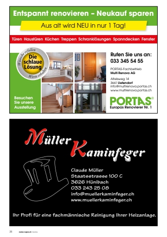 26 meine-region.ch VereineBesuchen Sie unsere AusstellungEntspannt renovieren %u2013 Neukauf sparenAus alt wird NEU in nur 1 Tag!T%u00fcren Haust%u00fcren K%u00fcchen Treppen Schrankl%u00f6sungen Spanndecken FensterRufen Sie uns an:033 345 54 55PORTAS-FachbetriebMulti Renova AGAltelsweg 143661 Uetendorfinfo@multirenova.portas.ch www.multirenova.portas.ch