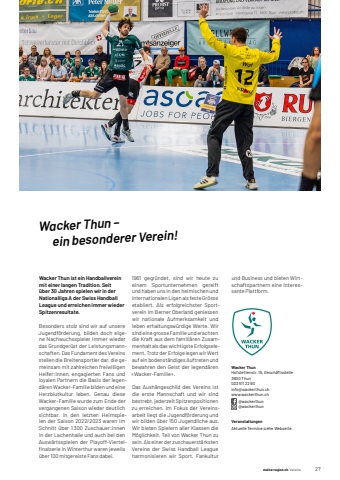 meine-region.ch meine-region.ch Vereine 271Wacker Thun %u2013 ein besonderer Verein! Wacker Thun ist ein Handballverein mit einer langen Tradition. Seit %u00fcber 30 Jahren spielen wir in der Nationalliga A der Swiss Handball League und erreichen immer wieder Spitzenresultate.Besonders stolz sind wir auf unsere Jugendf%u00f6rderung, bilden doch eigene Nachwuchsspieler immer wieder das Grundger%u00fcst der Leistungsmannschaften. Das Fundament des Vereins stellen die Breitensportler dar, die gemeinsam mit zahlreichen freiwilligen Helfer:innen, engagierten Fans und loyalen Partnern die Basis der legend%u00e4ren Wacker-Familie bilden und eine Herzblutkultur leben. Genau diese Wacker-Familie wurde zum Ende der vergangenen Saison wieder deutlich sichtbar. In den letzten Heimspielen der Saison 2022/2023 waren im Schnitt %u00fcber 1 300 Zuschauer:innen in der Lachenhalle und auch bei den Ausw%u00e4rtsspielen der Playoff-Viertelfi nalserie in Winterthur waren jeweils %u00fcber 100 mitgereiste Fans dabei.1961 gegr%u00fcndet, sind wir heute zu einem Sportunternehmen gereift und haben uns in den heimischen und internationalen Ligen als feste Gr%u00f6sse etabliert. Als erfolgreichster Sportverein im Berner Oberland geniessen wir nationale Aufmerksamkeit und leben erhaltungsw%u00fcrdige Werte. Wir sind eine grosse Familie und erachten die Kraft aus dem famili%u00e4ren Zusammenhalt als das wichtigste Erfolgselement. Trotz der Erfolge legen wir Wert auf ein bodenst%u00e4ndiges Auftreten und bewahren den Geist der legend%u00e4ren %u00abWacker-Familie%u00bb.Das Aush%u00e4ngeschild des Vereins ist die erste Mannschaft und wir sind bestrebt, jederzeit Spitzenpositionen zu erreichen. Im Fokus der Vereinsarbeit liegt die Jugendf%u00f6rderung und wir bilden %u00fcber 150 Jugendliche aus. Wir bieten Spielern aller Klassen die M%u00f6glichkeit, Teil von Wacker Thun zu sein. Als einer der zuschauerst%u00e4rksten Vereine der Swiss Handball League harmonisieren wir Sport, Fankultur Wacker ThunHofstettenstr. 15, Gesch%u00e4ftsstelle3600 Thun033 511 22 60info@wackerthun.chwww.wackerthun.ch @wackerthun @wackerthunVeranstaltungenAktuelle%u0009Termine%u0009siehe%u0009Webseite.und Business und bieten Wirtschaftspartnern eine interessante Plattform.