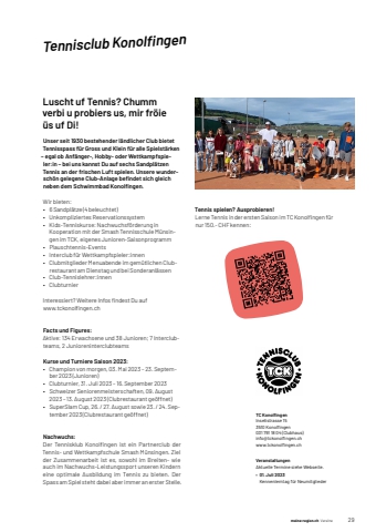 meine-region.ch meine-region.ch Vereine 291Tennisclub Konolfi ngen Luscht uf Tennis? Chumm verbi u probiers us, mir fr%u00f6ie %u00fcs uf Di!Unser seit 1930 bestehender l%u00e4ndlicher Club bietet Tennisspass f%u00fcr Gross und Klein f%u00fcr alle Spielst%u00e4rken%u2013 egal ob Anf%u00e4nger-, Hobby- oder Wettkampfspieler:in %u2013 bei uns kannst Du auf sechs Sandpl%u00e4tzen Tennis an der frischen Luft spielen. Unsere wundersch%u00f6n gelegene Club-Anlage befi ndet sich gleich neben dem Schwimmbad Konolfi ngen.Wir bieten:%u2022 6 Sandpl%u00e4tze (4 beleuchtet)%u2022 Unkompliziertes Reservationssystem%u2022 Kids-Tenniskurse: Nachwuchsf%u00f6rderung in Kooperation mit der Smash Tennisschule M%u00fcnsingen im TCK, eigenes Junioren-Saisonprogramm%u2022 Plauschtennis-Events%u2022 Interclub f%u00fcr Wettkampfspieler:innen%u2022 Clubmitglieder Menuabende im gem%u00fctlichen Clubrestaurant am Dienstag und bei Sonderanl%u00e4ssen%u2022 Club-Tennislehrer:innen%u2022 ClubturnierInteressiert? Weitere Infos fi ndest Du auf www.tckonolfi ngen.chFacts und Figures:Aktive: 134 Erwachsene und 38 Junioren; 7 Interclubteams, 2 JunioreninterclubteamsKurse und Turniere Saison 2023: %u2022 Champion von morgen, 03. Mai 2023 %u2013 23. September 2023 (Junioren)%u2022 Clubturnier, 31. Juli 2023 %u2013 16. September 2023%u2022 Schweizer Seniorenmeisterschaften, 09. August 2023 %u2013 13. August 2023 (Clubrestaurant ge%u00f6ffnet)%u2022 SuperSlam Cup, 26. / 27. August sowie 23. / 24. September 2023 (Clubrestaurant ge%u00f6ffnet)Nachwuchs:Der Tennisklub Konolfi ngen ist ein Partnerclub der Tennis- und Wettkampfschule Smash M%u00fcnsingen. Ziel der Zusammenarbeit ist es, sowohl im Breiten- wie auch im Nachwuchs-Leistungssport unseren Kindern eine optimale Ausbildung im Tennis zu bieten. Der Spass am Spiel steht dabei aber immer an erster Stelle.TC Konolfi ngenInselistrasse 153510%u0009Konolfi%u0009ngen031%u0009791%u000918%u000904%u0009(Clubhaus)info@tckonolfi%u0009ngen.chwww.tckonolfi%u0009ngen.chVeranstaltungenAktuelle%u0009Termine%u0009siehe%u0009Webseite.%u2022 01. Juli 2023Kennenlerntag%u0009f%u00fcr%u0009NeumitgliederTennis spielen? Ausprobieren!Lerne Tennis in der ersten Saison im TC Konolfi ngen f%u00fcr nur 150.- CHF kennen: