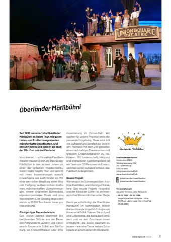 1 meine-region.ch Vereine meine-region.ch Vereine 31Oberl%u00e4nder M%u00e4rlib%u00fchniSeit 1997 inszeniert die Oberl%u00e4nder M%u00e4rlib%u00fchni im Raum Thun mit guten Laien- und Profi schauspielenden m%u00e4rchenhafte Geschichten, und entf%u00fchrt Gross und Klein in die Welt der M%u00e4rchen und der Fantasie.Vom kleinen, traditionellen Familientheater mauserte sich die Oberl%u00e4nder M%u00e4rlib%u00fchni in den letzten Jahren zu einer der gr%u00f6ssten Theaterinstitutionen in der Region Thun und spricht mit ihren Inszenierungen sowohl Erwachsene wie auch Kinder an. Mit einer wertvollen Handlung voller Witz und Tiefgang, authentischen Kost%u00fcmen, m%u00e4rchenhaften Lichtstimmungen, einem originellen B%u00fchnenbild, eigenkomponierter Musik und professionellem Live-Gesang begeistert sie bis zu 10 000 Zuschauer:innen pro Inszenierung.Einzigartiges GesamterlebnisSeit vielen Jahren stammen die ber%u00fchrenden St%u00fccke aus der Feder von Mitgr%u00fcnderin, Autorin und Regisseurin Annemarie St%u00e4hli aus Steffi sburg. Ob Freilichttheater oder eine Inszenierung im Circus-Zelt: Wir suchen f%u00fcr unsere Projekte stets die passende Umgebung. Diese wird mit viel Aufwand und Sorgfalt zur jeweiligen Thematik mit dem Ziel gestaltet, einen nachhaltigen Theateranlass mit grossem Erlebnischarakter zu realisieren. Mit Leidenschaft, Herzblut und erarbeiteter Fachkompetenz ist ein Team von 120 Personen im Einsatz, welches keinen Aufwand scheut, das Publikum zu begeistern. Neues ProjektWintersport im Schneegest%u00f6ber, frostige Rivalit%u00e4ten, warmherzige Charaktere: Das neuste Projekt %u00abVogellisi und der K%u00f6nig der L%u00fcfte%u00bb ist ein nostalgisches Winterm%u00e4rchen voller Magie. Damit vervollst%u00e4ndigt die Oberl%u00e4nder M%u00e4rlib%u00fchni im kommenden Winter die ber%u00fchrende Vogellisi-Trilogie von Annemarie St%u00e4hli. Freuen Sie sich auf eine Geschichte, die bezaubert, am%u00fcsiert und es den Zuschauer:innenerm%u00f6glicht, die Seele baumeln zu lassen %u2013 wie eine Tasse heisse Schokolade an einem kalten Winterabend. Oberl%u00e4nder M%u00e4rlib%u00fchni Annemarie St%u00e4hliWeiergrabenweg%u000942e3612%u0009Steffi%u0009 %u0009sburg079 719 59 11info@maerchenhaft.chwww.maerchenhaft.ch @oberlaender.maerlibuehni @oberlaender.maerlibuehniVeranstaltungenAktuelle%u0009Termine%u0009siehe%u0009Webseite.%u2022 08.12.2023 - 20.01.2024Vogellisi%u0009und%u0009der%u0009K%u00f6nig%u0009der%u0009L%u00fcfteKK Thun, Lachensaal. Vorverkauf ab 25.08.2023