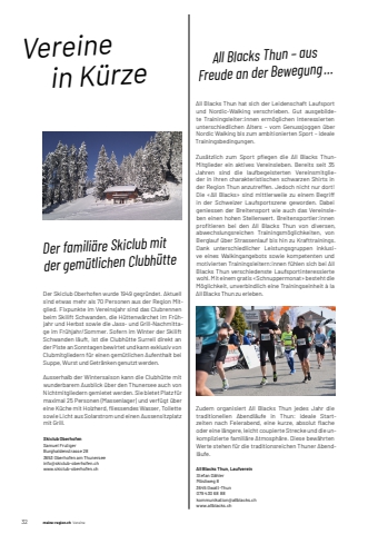 321 meine-region.ch meine-region.ch VereineVereine in K%u00fcrzeDer Skiclub Oberhofen wurde 1949 gegr%u00fcndet. Aktuell sind etwas mehr als 70 Personen aus der Region Mitglied. Fixpunkte im Vereinsjahr sind das Clubrennen beim Skilift Schwanden, die H%u00fcttenw%u00e4rchet im Fr%u00fchjahr und Herbst sowie die Jass- und Grill-Nachmittage im Fr%u00fchjahr/Sommer. Sofern im Winter der Skilift Schwanden l%u00e4uft, ist die Clubh%u00fctte Surreli direkt an der Piste an Sonntagen bewirtet und kann exklusiv von Clubmitgliedern f%u00fcr einen gem%u00fctlichen Aufenthalt bei Suppe, Wurst und Getr%u00e4nken genutzt werden.Ausserhalb der Wintersaison kann die Clubh%u00fctte mit wunderbarem Ausblick %u00fcber den Thunersee auch von Nichtmitgliedern gemietet werden. Sie bietet Platz f%u00fcr maximal 25 Personen (Massenlager) und verf%u00fcgt %u00fcber eine K%u00fcche mit Holzherd, fl iessendes Wasser, Toilette sowie Licht aus Solarstrom und einen Aussensitzplatz mit Grill.Skiclub OberhofenSamuel FrutigerBurghaldenstrasse 283653 Oberhofen am Thunerseeinfo@skiclub-oberhofen.chwww.skiclub-oberhofen.chAll Blacks Thun %u2013 aus Freude an der Bewegung %u2026All Blacks Thun hat sich der Leidenschaft Laufsport und Nordic-Walking verschrieben. Gut ausgebildete Trainingsleiter:innen erm%u00f6glichen Interessierten unterschiedlichen Alters %u2013 vom Genussjoggen %u00fcber Nordic Walking bis zum ambitionierten Sport %u2013 ideale Trainingsbedingungen.Zus%u00e4tzlich zum Sport pfl egen die All Blacks ThunMitglieder ein aktives Vereinsleben. Bereits seit 35 Jahren sind die laufbegeisterten Vereinsmitglieder in ihren charakteristischen schwarzen Shirts in der Region Thun anzutreffen. Jedoch nicht nur dort! Die %u00abAll Blacks%u00bb sind mittlerweile zu einem Begriff in der Schweizer Laufsportszene geworden. Dabei geniessen der Breitensport wie auch das Vereinsleben einen hohen Stellenwert. Breitensportler:innenprofi tieren bei den All Blacks Thun von diversen, abwechslungsreichen Trainingsm%u00f6glichkeiten, von Berglauf %u00fcber Strassenlauf bis hin zu Krafttrainings. Dank unterschiedlicher Leistungsgruppen inklusive eines Walkingangebots sowie kompetenten und motivierten Trainingsleitern:innen f%u00fchlen sich bei All Blacks Thun verschiedenste Laufsportinteressierte wohl. Mit einem gratis %u00abSchnuppermonat%u00bb besteht die M%u00f6glichkeit, unverbindlich eine Trainingseinheit %u00e0 la All Blacks Thun zu erleben.Zudem organisiert All Blacks Thun jedes Jahr die traditionellen Abendl%u00e4ufe in Thun: ideale Startzeiten nach Feierabend, eine kurze, absolut fl acheoder eine l%u00e4ngere, leicht coupierte Strecke und die unkomplizierte famili%u00e4re Atmosph%u00e4re. Diese bew%u00e4hrten Werte stehen f%u00fcr die traditionsreichen Thuner Abendl%u00e4ufe.All Blacks Thun, LaufvereinStefan D%u00e4hlerM%u00f6sliweg%u000983645 Gwatt-Thun079 430 68 88kommunikation@allblacks.chwww.allblacks.chDer famili%u00e4re Skiclub mit der gem%u00fctlichen Clubh%u00fctte