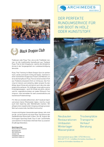 1 meine-region.ch Vereine meine-region.ch Vereine 33Vereine in K%u00fcrzeDer Skiclub Oberhofen wurde 1949 gegr%u00fcndet. Aktuell sind etwas mehr als 70 Personen aus der Region Mit,glied. Fixpunkte im Vereinsjahr sind das Clubrennen beim Skilift Schwanden, die H%u00fcttenw%u00e4rchet im Fr%u00fch,jahr und Herbst sowie die Jass- und Grill-Nachmitta,ge im Fr%u00fchjahr/Sommer. Sofern im Winter der Skilift Schwanden l%u00e4uft, ist die Clubh%u00fctte Surreli direkt an der Piste an Sonntagen bewirtet und kann exklusiv von Clubmitgliedern f%u00fcr einen gem%u00fctlichen Aufenthalt bei Suppe, Wurst und Getr%u00e4nken genutzt werden.Ausserhalb der Wintersaison kann die Clubh%u00fctte mit wunderbarem Ausblick %u00fcber den Thunersee auch von Nichtmitgliedern gemietet werden. Sie bietet Platz f%u00fcr maximal 25 Personen (Massenlager) und verf%u00fcgt %u00fcber eine K%u00fcche mit Holzherd, fl iessendes Wasser, Toilette sowie Licht aus Solarstrom und einen Aussensitzplatz mit Grill.Skiclub OberhofenSamuel FrutigerBurghaldenstrasse 283653 Oberhofen am Thunerseeinfo@skiclub-oberhofen.chwww.skiclub-oberhofen.chAll Blacks Thun %u2013 aus Freude an der Bewegung %u2026All Blacks Thun hat sich der Leidenschaft Laufsport und Nordic-Walking verschrieben. Gut ausgebilde,te Trainingsleiter:innen erm%u00f6glichen Interessierten unterschiedlichen Alters %u2013 vom Genussjoggen %u00fcber Nordic Walking bis zum ambitionierten Sport %u2013 ideale Trainingsbedingungen.Zus%u00e4tzlich zum Sport pfl egen die All Blacks Thun,Mitglieder ein aktives Vereinsleben. Bereits seit 35 Jahren sind die laufbegeisterten Vereinsmitglie,der in ihren charakteristischen schwarzen Shirts in der Region Thun anzutreffen. Jedoch nicht nur dort! Die %u00abAll Blacks%u00bb sind mittlerweile zu einem Begriff in der Schweizer Laufsportszene geworden. Dabei geniessen der Breitensport wie auch das Vereinsle,ben einen hohen Stellenwert. Breitensportler:innenprofi tieren bei den All Blacks Thun von diversen, abwechslungsreichen Trainingsm%u00f6glichkeiten, von Berglauf %u00fcber Strassenlauf bis hin zu Krafttrainings. Dank unterschiedlicher Leistungsgruppen inklusi,ve eines Walkingangebots sowie kompetenten und motivierten Trainingsleitern:innen f%u00fchlen sich bei All Blacks Thun verschiedenste Laufsportinteressierte wohl. Mit einem gratis %u00abSchnuppermonat%u00bb besteht die M%u00f6glichkeit, unverbindlich eine Trainingseinheit %u00e0 la All Blacks Thun zu erleben.Zudem organisiert All Blacks Thun jedes Jahr die traditionellen Abendl%u00e4ufe in Thun: ideale Start,zeiten nach Feierabend, eine kurze, absolut fl acheoder eine l%u00e4ngere, leicht coupierte Strecke und die un,komplizierte famili%u00e4re Atmosph%u00e4re. Diese bew%u00e4hrten Werte stehen f%u00fcr die traditionsreichen Thuner Abend,l%u00e4ufe.All Blacks Thun, LaufvereinStefan D%u00e4hlerM%u00f6sliweg%u000983645 Gwatt-Thun079 430 68 88kommunikation@allblacks.chwww.allblacks.chDer famili%u00e4re Skiclub mit der gem%u00fctlichen Clubh%u00fcttemeine-region.ch Vereine 2Black Dragon ClubThaiboxen oder Muay Thai, wie es die Thail%u00e4nder nennen, ist die traditionelle Kampfkunst aus Thailand. Muay Thai ist die Kriegskunst, welche die k%u00f6nigliche Armee in der Vergangenheit zur Landesverteidigung benutzte. Muay Thai Training im Black Dragon Gym ist authentisch, seri%u00f6s und macht richtig viel Spass. Trainiere in einer motivierten Gruppe aus Frauen und M%u00e4nnern, erlerne die Kampfkunst Muay Thai von einem echten Profi aus Thailand und powere Dich so richtig aus. Das Training ist intensiv und vielseitig, dabei vergisst Du den Alltag, baust Stress ab und kannst auch das eine oder andere Kilo verlieren. F%u00fcr Anf%u00e4nger:innen gibt es extra Einsteigergruppen %u2013 auch f%u00fcr Kinder ab sechs Jahren und f%u00fcr Jugendliche bieten wir jeden Mittwoch Trainings an. Jetzt anmelden f%u00fcr zwei unverbindliche und kostenlose Probetrainings.P.S: Bei uns sind alle willkommen, die Freude am Sport und einem fairen Miteinander haben. Und Du musst auch kein Sparring oder Wettk%u00e4mpfe machen. Wir pfl egen einen respektvollen Umgang und legen grossen Wert auf unsere tolle, famili%u00e4re Community!Unsere wichtigsten Veranstaltungen dieses Jahr sind am 08. Juli ein Auftritt mit einer Muay Thai Show in der thail%u00e4ndischen Botschaft in Bern, am 26. August der Schnupper-Sporttag Stadt Thun in der Lachenhalle, und nat%u00fcrlich im November 2023 die Feier zu unserem 25-j%u00e4hrigen Bestehen. Black Dragon ClubMartina Bracher SukachonBernstrasse 363612%u0009Steffi%u0009 %u0009sburg079 691 17 59info@black-dragon.chwww.black-dragon.chViertel-Inserat, 89 x 134 mmViertel-Inserat, 89 x 134 mmDER PERFEKTE RUNDUMSERVICE F%u00dcR IHR BOOT IN HOLZ ODER KUNSTSTOFF.NeubautenRestaurationenUmbautenWinterlagerWasserpl%u00e4tzeTrockenpl%u00e4tzeTransporteVerkaufBeratungSimmentalstrasse 28A | 3752 Wimmis033 657 71 21 | info@archimedes-bootbau.chwww.archimedes-bootbau.ch