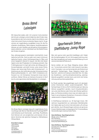 3 meine-region.ch Vereine meine-region.ch Vereine 35Modellfl uggruppeThunAls Mitglied im Schweizerischen Aeroclub betreibt und f%u00f6rdert die Modellfl uggruppe Thun seit bald 90 Jah,ren den Modellfl ug in seiner ganzen Vielfalt, sei es als sinnvolle Freizeitbesch%u00e4ftigung f%u00fcr jedes Alter oder als Einstieg in die Fliegerei.Etwa 130 Vereinsmitglieder bauen und fl iegen ihre Modellfl ugzeuge mit grosser Sorgfalt, er%u00f6rtern kniffl ige technische L%u00f6sungen im Kollegenkreis, trainieren mit Geschick und Ausdauer Kunstfl ug in hoher Vollendung, steuern Helikopter gekonnt vor staunendem Publikum oder freuen sich beim Segelfl ug am Spiel mit den Luft,str%u00f6mungen. Wettbewerbe vereinsintern, schweize,risch oder international er%u00f6ffnen die M%u00f6glichkeit, sich mit Modellfl iegenden in friedlichem Wettstreit zu mes,sen.Bei Jugendlichen bildet das Hobby nicht selten die Basis zu einer sp%u00e4teren Berufskarriere in der Luftfahrt. Die Modellfl uggruppe Thun f%u00fchrt auch deshalb von Zeit zu Zeit Baukurse durch, um vorab jungen Menschen den Eintritt in die Welt der Modellfl iegerei zu vereinfachen.Haben wir Dein Interesse geweckt? Wir freuen uns auf Dich! Ein Besuch auf unserer Webseite lohnt sich ganz besonders. Falls Du Fragen zu unserem Verein oder Interesse an einem Beitritt hast, so nimm doch ein,fach Kontakt mit einem Vorstandsmitglied auf. Du bist nat%u00fcrlich auch als Besucher:in z.B. bei einem unserer Gruppenwettbewerbe auf der Thuner-Allmend herz,lich willkommen, oder bei einer Monatsversammlung in unserem Clubhaus.Modellfl uggruppe ThunFritz FankhauserBl%u00fcmlisalpstrasse 443627 Heimberg079 646 98 52fritz.fankhauser@mgthun.chwww.mgthun.chViertel-Inserat, 89 x 134 mmViertel-Inserat, 89 x 134 mmmeine-region.ch Vereine 4Wer sich gerne mehr sportlich bet%u00e4tigen will, fi ndet die Kontaktangaben f%u00fcr ein Schnuppertraining unter den Sportangeboten auf www.satussteffi sburg.ch und www.jumpropesteffi sburg.ch. Gerne stellen wir nun Rope Skipping etwas n%u00e4her vor: Turnschuhe und ein Seil, mehr braucht man dazu nicht. Fast jede:r von uns hat es bereits als Kind einmal gemacht: Seilspringen. Rope Skipping heisst die Sportart, welche sich daraus entwickelt hat. Ein ideales Konditions- und Koordinationstraining, welches %u00fcberall ausgef%u00fchrt werden kann und nicht viel Vorbereitung und Ausr%u00fcstung ben%u00f6tigt.Zu Musik werden Sprungabfolgen auch mit akrobatischen Elementen selber zusammengestellt. Mehrfachspr%u00fcnge mit bis zu f%u00fcnf Umdrehungen pro Sprung k%u00f6nnen ausgef%u00fchrt werden. Auch Kreuzkombinationen unter den Beinen oder hinter dem R%u00fccken geh%u00f6ren dazu. An Meisterschaften misst man sich allein oder im Team in verschiedenen Disziplinen. Einerseits in Shows %u2013 andererseits in Speed-Disziplinen.In Steffi sburg trainieren ca. 45 Springer:innen. Wir nehmen haupts%u00e4chlich an nationalen Wettk%u00e4mpfen teil, haben aber auch schon internationale Luft schnuppern d%u00fcrfen. Auch Showanfragen nehmen wir gerne an. Unsere Darbietungen sind geeignet f%u00fcr Firmenanl%u00e4sse, Veranstaltungen sowie private Feste. Satus Steffi sburg - Rope Skipping SeniorsWenger%u0009Jenny,%u0009079%u0009816%u000946%u000907%u00093612%u0009Steffi%u0009 %u0009sburgjenny.wenger@hotmail.comwww.jumpropesteffi%u0009 %u0009sburg.chSatus Steffi sburg - Rope Skipping JuniorsSchneider Sara, 079 458 82 173612%u0009Steffi%u0009 %u0009sburgsara23.schneider@gmail.comwww.jumpropesteffi%u0009 %u0009sburg.chBrass Band LeissigenWir besuchen jedes Jahr mit unseren Instrumenten die Schule Leissigen und erm%u00f6glichen den Kindern das Ausprobieren der Instrumente, damit sie erfahren, welches Instrument ihnen am ehesten Spass macht. So gewinnen wir regelm%u00e4ssig Jungbl%u00e4ser:innen f%u00fcr die Musikanten-Ausbildung. Dank eigener Ausbildungsleute k%u00f6nnen wir sehr fl exible und attraktive Schulungskonzepte anbieten und so individuell auf die Bed%u00fcrfnisse der Kinder eingehen.Das Jahresprogramm beinhaltet mehrheitlich musikalische Auftritte. Doch es gibt noch zwei nichtmusikalische Events: einen Schneesporttag im M%u00e4rz und einen Spaghetti-Abend im August, bei dem die Geselligkeit unter den Mitgliedern im Vordergrund steht. Das Fr%u00fchlingskonzert im April gilt sicher als H%u00f6hepunkt im Konzertkalender und steht immer unter einem Motto. Dieses Jahr heisst das Motto %u201e%u00e4cht Schwiizerisch%u201c %u2013 in Anlehnung an die Aufforderung des Schweizerischen Blasmusikverbandes im Jahr 2023 mindestens ein Konzert nur mit Schweizer Komponist:innen durchzuf%u00fchren. Weiter f%u00fchren wir kleinere Konzerte im Dorf durch und organisieren die Bundesfeier in Leissigen. Die Brass Band Leissigen besucht regelm%u00e4ssig Kreismusiktage oder Berner Oberl%u00e4ndische Musiktage BOMT und teilweise auch Kantonale- und Eidg. Musikfeste. Dort k%u00f6nnen wir uns vergleichen und messen mit anderen Vereinen der gleichen Kategorie, St%u00e4rkeklasse 3 Brass Band.Brass Band LeissigenJakob%u0009R%u00f6thlinF%u00f6hrenweg%u0009383700 Spiez079 463 89 84info@bbleissigen.chwww.bbleissigen.chSportverein Satus Steffi sburg: Jump Rope
