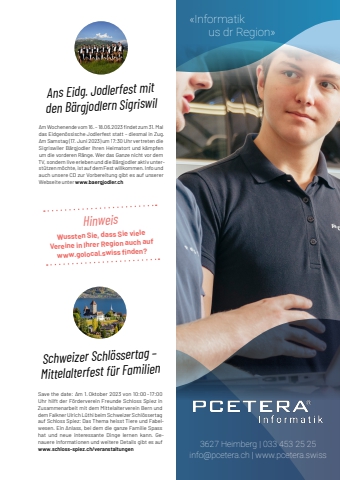 1 meine-region.ch Vereine meine-region.ch Vereine 43Freizeit und Freu (n) de Mit dem Bikein den FeierabendGl%u00fcckspilze sammeln und bestimmenThuner AbendlaufMittwochs oder Donnerstags laden wir zur Abendfahrt in zwei Fahr- und Konditionsleveln ein. Unsere Bike,touren stehen sowohl Clubmitgliedern als auch G%u00e4sten offen. Die Teilnahme ist mit Ausnahme von allf%u00e4lligen Auslagen f%u00fcr Bahnen und Restaurantbesuche kostenlos. Die Touren weisen unterschiedliche Schwierigkeits,grade auf, die jeweils in den Tourenbeschreibungen angegeben werden. Die Detailinformationen werden ca. zwei bis vier Wochen vor der jeweiligen Tour auf unserer Webseite ver%u00f6ffentlicht: www.rcsteffi sburg.chAll Blacks Thun organisiert jedes Jahr die traditionel,len Abendl%u00e4ufe in Thun: ideale Startzeiten nach Fei,erabend, eine kurze, absolut fl ache oder eine l%u00e4ngere, leicht coupierte Strecke und die unkomplizierte, famili,%u00e4re Atmosph%u00e4re. Diese bew%u00e4hrten Werte stehen f%u00fcr die traditionsreichen Thuner Abendl%u00e4ufe. Zur%u00fcck im Ziel erwartet Euch ein reich best%u00fccktes Buffet mit feinen Backwaren und Sandwiches. Evtl. reist Ihr mit einem Preis heim, denn unter allen Teilnehmer:innen werden Preise verlost. Der n%u00e4chste Thuner Abendlauf ist am 15. August 2023 %u2013 Start 2 km um 19:00 Uhr, Start 7 km um 19:30 Uhr. Anmeldung und Umkleide: Primarschule Allmendingen, Im Dorf 11, 3608 Thun. Die Anmeldung ist bis 30 Minuten vor dem Start vor Ort m%u00f6glich. Alle Infos auf www.allblacks.chSteinpilz oder Gallenr%u00f6hrling? Wenn man das doch nur w%u00fcsste! Im Pilzverein lernt man an Bestimmungsaben,den, Exkursionen und Vortr%u00e4gen, Speisepilze von gifti,gen Pilzen zu unterscheiden. Begleiten Sie uns z. B. am 27. August 2023 zur Pilzexkursion. Treffpunkt 10:00 Uhr bei Br%u00e4tlistelle Ch%u00fcestelli, Bushaltestelle Heimensch,wand Kuhstelle. Nicht-Vereinsmitglieder sind jederzeit herzlich willkommen! www.pilzverein-thun.chBoccia kann von allen innert k%u00fcrzester Zeit erlernt und bis ins hohe Alter gespielt werden. Auf unserer Anlage wird fast t%u00e4glich gespielt, insbesondere am Nachmittag. Ein- bis zweimal pro Jahr fi nden Einstei,ger-/Schnupperkurse statt . Gleich neben den Bahnen liegt das sch%u00f6ne Clubbeizli, wo man nach dem Spiel noch gem%u00fctlich zusammensitzen kann.Besuchen Sie uns auf unserer topmodernen Anlage und spielen Sie ein paar Kugeln mit uns. Sie sind herzlich willkommen. www.bocciaclub-thun.chEine ruhige Kugel schieben im Boccia Club Thunmeine-region.ch Vereine 2Schweizer Schl%u00f6ssertag %u2013 Mittelalterfest f%u00fcr FamilienAns Eidg. Jodlerfest mit den B%u00e4rgj odlern SigriswilAm Wochenende vom 16. %u2013 18.06.2023 fi ndet zum 31. Mal das Eidgen%u00f6ssische Jodlerfest statt %u2013 diesmal in Zug. Am Samstag (17. Juni 2023) um 17:30 Uhr vertreten die Sigriswiler B%u00e4rgj odler Ihren Heimatort und k%u00e4mpfen um die vorderen R%u00e4nge. Wer das Ganze nicht vor dem TV, sondern live erleben und die B%u00e4rgj odler aktiv unterst%u00fctzen m%u00f6chte, ist auf dem Fest willkommen. Info und auch unsere CD zur Vorbereitung gibt es auf unserer Webseite unter www.baergj odler.chSave the date: Am 1. Oktober 2023 von 10:00 - 17:00 Uhr hilft der F%u00f6rderverein Freunde Schloss Spiez in Zusammenarbeit mit dem Mittelalterverein Bern und dem Falkner Ulrich L%u00fcthi beim Schweizer Schl%u00f6ssertag auf Schloss Spiez: Das Thema heisst Tiere und Fabelwesen. Ein Anlass, bei dem die ganze Familie Spass hat und neue interessante Dinge lernen kann. Genauere Informationen und weitere Details gibt es auf www.schloss-spiez.ch/veranstaltungenHinweisWussten Sie, dass Sie vieleVereine in Ihrer Region auch aufwww.golocal.swiss fi nden?Viertel-Inserat, 89 x 134 mmViertel-Inserat, 89 x 134 mm3627 Heimberg | 033 453 25 25 info@pcetera.ch | www.pcetera.swiss%u00abInformatik us dr Region%u00bb