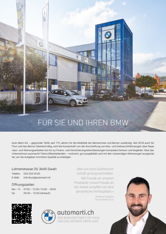46 meine-region.ch VereineF%u00dcR SIE UND IHREN BMWAuto Marti AG %u2013 gegr%u00fcndet 1848, seit 175 Jahren f%u00fcr die Mobilit%u00e4t der Bernerinnen und Berner zust%u00e4ndig. Seit 2018 auch f%u00fcr Thun und das Berner Oberland t%u00e4tig, wird die Kundschaft von der Anschaffung von Neu- und Gebrauchtfahrzeugen %u00fcber Reparatur- und Wartungsarbeiten bis hin zu Finanz- und Versicherungsdienstleistungen kompetent betreut und begleitet. Was das Unternehmen ausmacht? Seine Mitarbeitenden %u2013 motiviert, gut ausgebildet und mit den notwendigen Werkzeugen ausgestattet, um die Aufgaben mit hoher Qualit%u00e4t zu erledigen.%u00abBei uns wird Gastfreundschaft grossgeschrieben. Mit Freude an unseren Produkten sowie Freude an der Arbeit schaffen wir eine pers%u00f6nliche Atmosph%u00e4re.%u00bb Matthias Kappeler, Standortleiter ThunLohnerstrasse 29, 3645 GwattTelefon 033 334 20 60E-Mail info.thun@automarti.ch%u00d6ffnungszeiten Mo%u2009%u2013%u2009Fr 07.00%u2009%u2013%u200912.00%u200a/%u200a13:00%u2009%u2013%u200918:00Sa 09.00%u2009%u2013%u200913.00 (Verkauf)DER BMW PARTNER F%u00dcR THUN UND DAS BERNER OBERLAND