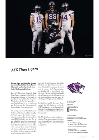 1 meine-region.ch Vereine meine-region.ch Vereine meine-region.ch Vereine1 47AFC Thun TigersPurple, silver and black: Der einzige American Football Verein im Berner Oberland %u2013 und ein Verein mit einer tollen Nachwuchsabteilung.Der AFC (American Football Club) Thun Tigers wurde am 5. Mai 2000 im Restaurant Rathaus in Thun gegr%u00fcndet. Der Verein hat den Zweck, seinen Mitgliedern die Aus%u00fcbung des American Football Sports zu erm%u00f6glichen, zu f%u00f6rdern und die Kameradschaft innerhalb des Vereins zu pfl egen. Als einziger American Football Verein im Berner Oberland wird das Angebot im Breitensport der Region entsprechend erweitert. Der Verein umfasst rund 300 Mitglieder und das Ziel ist es, m%u00f6glichst allen Interessenten die M%u00f6glichkeit zu bieten, diesen einzigartigen Sport aus%u00fcben zu k%u00f6nnen. Dabei wird insbesondere grossen Wert auf die Nachwuchsf%u00f6rderung gelegt. So geh%u00f6rt das Juniorenprogramm zu den erfolgreichsten schweizweit.Der AFC Thun Tigers ist Seit 2001 Mitglied des Schweizerischen American Football Verbandes und nimmt mit all seinen f%u00fcnf Mannschaften am Ligabetrieb in der Schweiz teil: die erste Mannschaft (Nationalliga A), die U19-Junioren, die U16-Junioren, die Ultimate Flags und das Team f%u00fcr die j%u00fcngsten Mitglieder, die U13 Flags.Der Spielbetrieb f%u00fcr die erste Mannschaft, die U19-Junioren sowie die U13 Flags dauert von April bis Juli, die Ultimate Flag-Saison von Mai bis September und die U16-Saison fi ndet im Herbst statt. Die Pfl ichtspiele werden im Lachenstadion Thun ausgetragen. Daneben wird ein ganzj%u00e4hriger Trainingsbetrieb angeboten und es werden Coaches ausgebildet.AFC Thun TigersPostfach 223603 Thuninfo@thun-tigers.chwww.thun-tigers.ch @thuntigers @afcthuntigersVeranstaltungenAktuelle Termine und Details entnehmen Sie bitte immer unserer Webseite.%u2022 17. Juni 2023 Familyday14:30%u0009Uhr:%u0009U19%u0009vs.%u0009Basel%u0009Renegades18:00%u0009Uhr:%u0009NLA%u0009vs.%u0009Bern%u0009Grizzlies%u0009%u2022 24. Juni 202314:30%u0009Uhr:%u0009U19%u0009vs.%u0009St.%u0009Gallen%u0009Bears18:00%u0009Uhr:%u0009NLA%u0009vs.%u0009Z%u00fcrich%u0009Renegades%u0009%u00a9 @lars.kauzF%u00dcR SIE UND IHREN BMWAuto Marti AG %u2013 gegr%u00fcndet 1848, seit 175 Jahren f%u00fcr die Mobilit%u00e4t der Bernerinnen und Berner zust%u00e4ndig. Seit 2018 auch f%u00fcr Thun und das Berner Oberland t%u00e4tig, wird die Kundschaft von der Anschaffung von Neu- und Gebrauchtfahrzeugen %u00fcber Repa,ratur- und Wartungsarbeiten bis hin zu Finanz- und Versicherungsdienstleistungen kompetent betreut und begleitet. Was das Unternehmen ausmacht? Seine Mitarbeitenden %u2013 motiviert, gut ausgebildet und mit den notwendigen Werkzeugen ausgestat,tet, um die Aufgaben mit hoher Qualit%u00e4t zu erledigen.%u00abBei uns wird Gastfreund,schaft grossgeschrieben. Mit Freude an unseren Produkten sowie Freude an der Arbeit schaffen wir eine pers%u00f6nliche Atmosph%u00e4re.%u00bb Matthias Kappeler, Standortleiter ThunLohnerstrasse 29, 3645 GwattTelefon 033 334 20 60E-Mail info.thun@automarti.ch%u00d6ffnungszeiten Mo%u2009%u2013%u2009Fr 07.00%u2009%u2013%u200912.00%u200a/%u200a13:00%u2009%u2013%u200918:00Sa 09.00%u2009%u2013%u200913.00 (Verkauf)DER BMW PARTNER F%u00dcR THUN UND DAS BERNER OBERLAND