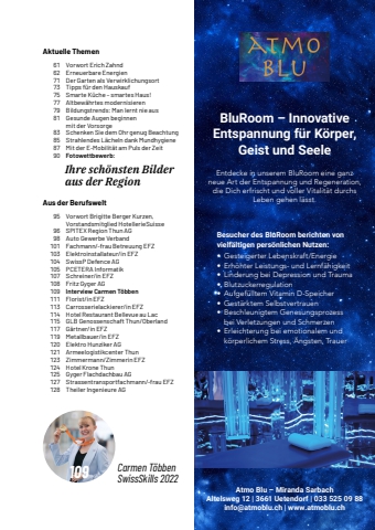 meine-region.ch Inhalt 3Aktuelle Themen%u0009 61%u0009 Vorwort Erich Zahnd%u0009 62%u0009 Erneuerbare Energien%u0009 71%u0009 Der Garten als Verwirklichungsort%u0009 73%u0009 Tipps f%u00fcr den Hauskauf%u0009 75%u0009 Smarte K%u00fcche %u2013 smartes Haus!%u0009 77%u0009 Altbew%u00e4hrtes modernisieren%u0009 79%u0009 Bildungstrends: Man lernt nie aus%u0009 81%u0009 Gesunde Augen beginnen mit der Vorsorge%u0009 83%u0009 Schenken Sie dem Ohr genug Beachtung%u0009 85%u0009 Strahlendes L%u00e4cheln dank Mundhygiene%u0009 87%u0009 Mit der E-Mobilit%u00e4t am Puls der Zeit%u0009 90%u0009 Fotowettbewerb:Aus der Berufswelt%u0009 95%u0009 Vorwort Brigitte Berger Kurzen, Vorstandsmitglied HotellerieSuisse%u0009 96%u0009 SPITEX Region Thun AG%u0009 98%u0009 Auto Gewerbe Verband%u0009 101%u0009 Fachmann/-frau Betreuung EFZ%u0009 103%u0009 Elektroinstallateur/in EFZ%u0009 104%u0009 SwissP Defence AG%u0009 105%u0009 PCETERA Informatik%u0009 107%u0009 Schreiner/in EFZ%u0009 108%u0009 Fritz Gyger AG%u0009 109%u0009 Interview Carmen T%u00f6bben%u0009 111%u0009 Florist/in EFZ%u0009 113%u0009 Carrosserielackierer/in EFZ%u0009 114%u0009 Hotel Restaurant Bellevue au Lac%u0009 115%u0009 GLB Genossenschaft Thun/Oberland%u0009 117%u0009 G%u00e4rtner/in EFZ%u0009 119%u0009 Metallbauer/in EFZ%u0009 120%u0009 Elektro Hunziker AG%u0009 121%u0009 Armeelogistikcenter Thun%u0009 123%u0009 Zimmermann/Zimmerin EFZ%u0009 124%u0009 Hotel Krone Thun%u0009 125%u0009 Gyger Flachdachbau AG%u0009 127%u0009 Strassentransportfachmann/-frau EFZ%u0009 128%u0009 TheilerIngenieure AGAnja von Allmensegelt davon Ihre sch%u00f6nsten Bilder aus der RegionCarmen T%u00f6bbenSwissSkills 2022 109BluRoom %u2013 Innovative Entspannung f%u00fcr K%u00f6rper, Geist und SeeleEntdecke in unserem BluRoom eine ganz neue Art der Entspannung und Regeneration, die Dich erfrischt und voller Vitalit%u00e4t durchs Leben gehen l%u00e4sst.Besucher des BluRoom berichten von vielf%u00e4ltigen pers%u00f6nlichen Nutzen:%u2022 Gesteigerter Lebenskraft/Energie%u2022 Erh%u00f6hter Leistungs- und Lernf%u00e4higkeit%u2022 Linderung bei Depression und Trauma%u2022 Blutzuckerregulation%u2022 Aufgef%u00fclltem Vitamin D-Speicher%u2022 Gest%u00e4rktem Selbstvertrauen%u2022 Beschleunigtem Genesungsprozess bei Verletzungen und Schmerzen%u2022 Erleichterung bei emotionalem und k%u00f6rperlichem Stress, %u00c4ngsten, TrauerAtmo Blu %u2013 Miranda SarbachAltelsweg 12 | 3661 Uetendorf | 033 525 09 88info@atmoblu.ch | www.atmoblu.ch