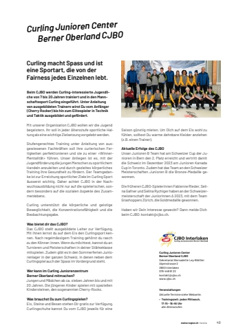 meine-region.ch meine-region.ch Vereine 491Curling Junioren Center Berner Oberland CJBOCurling macht Spass und ist eine Sportart, die von der Fairness jedes Einzelnen lebt. Beim CJBO werden Curling-interessierte Jugendliche von 7 bis 20 Jahren trainiert und in den Mannschaftssport Curling eingef%u00fchrt. Unter Anleitung von ausgebildeten Trainern wirst Du vom Anf%u00e4nger (Cherry Rocker) bis hin zum Elitespieler in Technik und Taktik ausgebildet und gef%u00f6rdert.Mit unserer Organisation CJBO wollen wir die Jugend begeistern. Ihr soll in jeder Altersstufe sportliche Haltung als eine wichtige Zielsetzung vorgelebt werden.Stufengerechtes Training unter Anleitung von ausgewiesenen Fachkr%u00e4ften soll ihre curlerischen Fertigkeiten perfektionieren und sie zu einer %u00abWinnerMentalit%u00e4t%u00bb f%u00fchren. Unser Anliegen ist es, mit der Jugendf%u00f6rderung die jungen Menschen zu sportlichem Handeln anzuleiten und durch gezieltes k%u00f6rperliches Training ihre Gesundheit zu f%u00f6rdern. Der Teamgedanke ist zur Erreichung sportlicher Ziele im Curling Sport %u00e4usserst wichtig. Daher achtet CJBO in der Nachwuchsausbildung nicht nur auf die spielerischen, sondern besonders auf die sozialen Aspekte des Zusammenlebens.Curling unterst%u00fctzt die k%u00f6rperliche und geistige Beweglichkeit, die Konzentrationsf%u00e4higkeit und die Beobachtungsgabe.Was bietet dir das CJBO?Das CJBO stellt ausgebildete Leiter zur Verf%u00fcgung. Mit ihnen lernst du auf dem Eis den Curlingsport kennen. Nach regelm%u00e4ssigem Training geh%u00f6rst du rasch zu den K%u00f6nner:innen. Wenn du m%u00f6chtest, kannst du an Turnieren und Meisterschaften in deiner St%u00e4rkeklasse mitspielen. Zudem gibt es in den Sommerferien Juniorenlager in der ganzen Schweiz, in denen neben dem Curlingspiel auch der Spass im Vordergrund steht.Wer kann im Curling Juniorenzentrum Berner Oberland mitmachen?Jungen und M%u00e4dchen ab ca. sieben Jahren bis und mit 20 Jahren. Die j%u00fcngeren Kinder spielen mit speziellen Kindersteinen, den sogenannten Cherry-Rocks.Was brauchst Du zum Curlingspielen?Eis, Steine und Besen stehen Dir gratis zur Verf%u00fcgung. Curlingschuhe kannst Du vom CJBO jeweils f%u00fcr eine Curling Junioren Center Berner Oberland CJBOSekretariat%u0009Bernadette%u0009Ley-Bl%u00e4ttlerAlpenstrasse 23800 Interlaken076 448 61 22kontakt@cjbo.chwww.cjbo.chVeranstaltungenAktuelle%u0009Termine%u0009siehe%u0009Webseite.%u2022 Trainingszeit: jeden Mittwoch,17:15 - 18:45 Uhralle AltersstufenSaison g%u00fcnstig mieten. Um Dich auf dem Eis wohl zu f%u00fchlen, solltest Du warme dehnbare Kleider anziehen (z.B. einen Trainer).Aktuelle Erfolge des CJBOUnser Junioren B Team hat am Schweizer Cup der Junioren in Bern den 2. Platz erreicht und vertritt damit die Schweiz im Dezember 2023 am Junioren Kanada Cup in Toronto. Zudem hat das Team an den Schweizer Meisterschaften Junioren B die Bronze-Medaille gewonnen.Die fr%u00fcheren CJBO-Spielerinnen Fabienne Rieder, Selina Gafner und Selina Rychiger haben an der Schweizermeisterschaft der Juniorinnen A 2023, mit dem Team Grashoppers Z%u00fcrich, die Goldmedaille gewonnen.Haben wir Dein Interesse geweckt? Dann melde Dich beim CJBO: kontakt@cjbo.ch.
