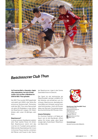 1 meine-region.ch Vereine meine-region.ch Vereine meine-region.ch Vereine1 53Beachsoccer Club ThunUs Freud am Ball u %u00abGwunder%u00bb %u00f6ppis n%u00f6is uszprobiere, hei sich d%u2019 Giele troffe u mit viu Elan u H%u00e4rzbluet im 2003 dr BSC-Thun gr%u00fcndet.Der BSC Thun wurde 2003 gegr%u00fcndet und spielt seit 2006 in der Swiss Beachsoccer Meisterschaft. Momentan stellt der BSC Thun eine Mannschaft mit aktiv 25 Mitgliedern in der h%u00f6chsten Beachsoccer League. Wir feiern dieses Jahr unser 20-j%u00e4hriges Jubil%u00e4um.Beachsoccer?In einem grossen Sandkasten spielen zehn Paar nackte F%u00fcsse mit einem Ball. Beachsoccer nennt sich das. Und hat mit Fussball wenig gemein. W%u00e4hrend die Rasenballsportler:innenim Sommer Pause machen, schwitzen die M%u00e4nner und Frauen in den Teams der Beachsoccer-Ligen in der Sonne. Sand klebt ihnen im Gesicht.Der Sport ist viel technischer als Rasenfussball, weniger sch%u00e4dlich f%u00fcr die Gelenke und attraktiver zum Zuschauen. Beachsoccer, das bedeutet: hohe B%u00e4lle, kein Zeitspiel, wenig Fouls, viele Fallr%u00fcckzieher. Und in 45 Minuten fallen vier Mal mehr Tore als bei einem durchschnittlichen 90-Minuten-Kick.Unsere MotivationDs %u00abSummer Feeling%u00bb u dr Spass am Sport isch bi d%u00e4 Oberl%u00e4nder d%u2019Motivation f%u00fcr immer wider ufem Sand vougas zg%u00e4 u Zueschauer i Beachsoccer-Bann z%u2019zi%u00e4.Beachsoccer Club Thun (BSC Thun)Heinz RindisbacherBlumensteinstrasse 773665%u0009Wattenwilbsc-thun@gmx.chwww.bsc-thun.ch @beachsoccer.thun @bsc_thunVeranstaltungenAktuelle%u0009Termine%u0009siehe%u0009Webseite.