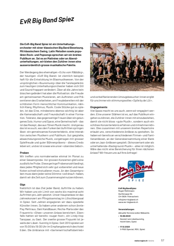 meine-region.ch meine-region.ch Vereine 571EvR Big Band SpiezDie EvR-Big Band Spiez ist ein Unterhaltungsorchester mit einer klassischen Big Band Besetzung. Mit klassischem Swing, Latin Melodien sowie popul%u00e4ren Rock- und Popsongs sprechen wir ein breites Publikum an. Sei es an Matin%u00e9es oder an Abendunterhaltungen, wir bieten den Zuh%u00f6rer:innen eine ausserordentlich grosse musikalische Palette.Der Werdegang des ehemaligen %u00abEcho vom R%u00e4bb%u00e4rg%u00bb, der heutigen %u00abEvR Big Band%u00bb ist ziemlich beispielhaft f%u00fcr die Entwicklung im Blasmusikwesen. Von der urspr%u00fcnglichen %u00abBuuremusig%u00bb %u00fcber die Tanzkapelle bis zum heutigen Unterhaltungsorchester haben sich Stil und Sound frappant ver%u00e4ndert. %u00dcber all die Jahre kein bisschen ge%u00e4ndert hat aber die Motivation: die Freude am gemeinsamen Musizieren, am Auftreten und Pr%u00e4sentieren des Erarbeiteten, am Freudebereiten mit der sch%u00f6nsten Form menschlicher Kommunikation, n%u00e4mlich Klang, Rhythmus, Musik. Coole St%u00fccke gut zu spielen, ist das Eine, mindestens ebenso wichtig ist aber die Kameradschaft und Freundschaft in einer Formation. Toleranz, das gegenseitige Freuen %u00fcber ein gelungenes Solo, Humor und Spass, eine Gemeinschaft %u2013 das ist das Rezept, das aus T%u00f6nen Musik macht. Und genau das ist es auch, was den Funken bei Auftritten springen l%u00e4sst: ein gemeinsames Konzerterlebnis, eine Interaktion zwischen Musikern und Publikum. Gut gespielte, abwechslungsreiche Musik, vorgetragen mit grosser Spielfreude und guter B%u00fchnenpr%u00e4senz %u2013 dieses Credo leben wir, und es ist sowas wie unser %u00aboberstes Gebot%u00bb.Proben Wir treffen uns normalerweise einmal im Monat zu einer Gesamtprobe. Vor grossen Konzerten gibt%u2019s eine zus%u00e4tzliche Probe. Diese geringe Probenanzahl bedingt, dass jedes Mitglied sich sehr gut vorbereitet und neue Noten schnell einstudieren muss. An den Gesamtproben muss dann jeder seine Stimme %u00abvoll drauf%u00bb haben, damit wir die Zeit zum Zusammenspiel nutzen k%u00f6nnen.Gigs Nat%u00fcrlich ist das Ziel jeder Band, Auftritte zu haben. Wir haben uns ein Limit von sechs bis maximal acht Auftritten pro Jahr gesetzt. Unser Hauptanlass ist das Jahreskonzert am Pfi ngstsamstag im L%u00f6tschbergsaal in Spiez. Seit Jahren engagieren wir dazu spezielle K%u00fcnstler:innen. So haben unter anderem schon AnnieMay Mettraux, Dani Kandlbauer, Recha-Maria oder das Frauentrio %u00abShee%u00bb unseren Anlass bereichert. Ebenfalls hatten wir bereits %u00absugar-foot%u00bb, ein Lindy-Hop Tanzpaar, zu Gast. Der zweite grosse Fixpunkt ist jeweils der L%u00e4set- Sunntig in Spiez. Seit 2010 spielen wir von 15:00 bis 19:00 Uhr im Empfangsbereich des Hotel Eden. Die Ambiance mit %u00abGartenwirtschaftsbetrieb%u00bb EvR Big BandSpiezRoger R%u00fcttimann Dorfstrasse 54CH-3634%u0009Thieracherninfo@evr-bigband.chwww.evr-bigband.chVeranstaltungenAktuelle%u0009Termine%u0009siehe%u0009Webseite.%u2022 10.09.2023Konzert am L%u00e4setsunntig, Hotel Eden, Spiez%u2022 17.12.2023X-MAS%u0009Special,%u0009ROX,%u0009Spiezund vorbeifl anierenden Umzugsbesucher:innen ergibt f%u00fcr uns immer ein stimmungsvolles %u00abSpile by de L%u00fct%u00bb.EngagementsViel Spass macht es uns auch, wenn wir engagiert werden. Eine unserer St%u00e4rken ist es, auf das Publikum eingehen zu k%u00f6nnen, die Zuh%u00f6rer:innen mit einzubeziehen, damit sie nicht bloss %u00abgute Musik%u00bb, sondern auch ein sch%u00f6nes Konzerterlebnis erfahren und mitnehmen k%u00f6nnen. Dies zusammen mit unserem breiten Repertoire erlaubt uns, verschiedenste Anl%u00e4sse zu gestalten. So haben wir bereits an verschiedenen Firmen- und Familienanl%u00e4ssen, an der Generalversammlung einer Bank oder an Jazz-Anl%u00e4ssen gespielt. Ob konzertant oder als unterhaltende %u00abBackground-Musik%u00bb %u2013 alles ist m%u00f6glich. W%u00e4re das nicht eine Bereicherung f%u00fcr Ihren n%u00e4chsten Anlass? Wir freuen uns auf Ihre Anfrage!