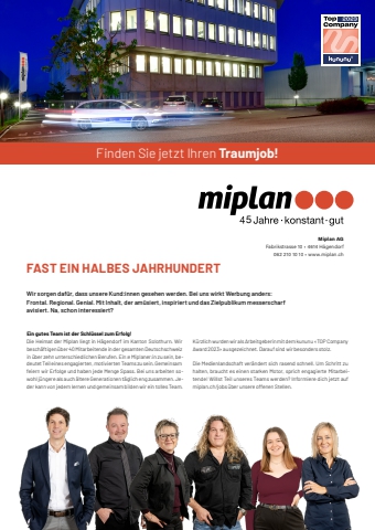 60 meine-region.ch ThemenberichteWir sorgen daf%u00fcr, dass unsere Kund:innen gesehen werden. Bei uns wirkt Werbung anders: Frontal. Regional. Genial. Mit Inhalt, der am%u00fcsiert, inspiriert und das Zielpublikum messerscharf avisiert. Na, schon interessiert?FAST EIN HALBES JAHRHUNDERT5fifffflffifl%u001a%u0019%u0018%u0017fifffflffifl%u001a%u0019%u0018ffiff%u0019%u0019%u0017%u0016%u0015%u0014%u0016%u0013%u0016%u0012%u0011%u0015%u0012%u0016%u0010%u000f%u000e%u0017%u000c%u000bffi%u0014%u0011%u0009%u0016%u0009%u0015%u0014%u0016%u0015%u0014%u0016%u0015%u0014%u0016%u0013%u0016%u0008%u0008%u0008%u0007%u0006fl%u0005%u0004ff%u0007%u0003Ein gutes Team ist der Schl%u00fcssel zum Erfolg!Die Heimat der Miplan liegt in H%u00e4gendorf im Kanton Solothurn. Wir besch%u00e4ftigen %u00fcber 40 Mitarbeitende in der gesamten Deutschschweiz in %u00fcber zehn unterschiedlichen Berufen. Ein:e Miplaner:in zu sein, bedeutet Teil eines engagierten, motivierten Teams zu sein. Gemeinsam feiern wir Erfolge und haben jede Menge Spass. Bei uns arbeiten sowohl j%u00fcngere als auch %u00e4ltere Generationen t%u00e4glich eng zusammen. Jeder kann von jedem lernen und gemeinsam bilden wir ein tolles Team. K%u00fcrzlich wurden wir als Arbeitgeberin mit dem kununu %u00abTOP Company Award 2023%u00bb ausgezeichnet. Darauf sind wir besonders stolz.Die Medienlandschaft ver%u00e4ndert sich rasend schnell. Um Schritt zu halten, braucht es einen starken Motor, sprich engagierte Mitarbeitende! Willst Teil unseres Teams werden? Informiere dich jetzt auf miplan.ch/jobs %u00fcber unsere offenen Stellen.Finden Sie jetzt Ihren Traumjob!