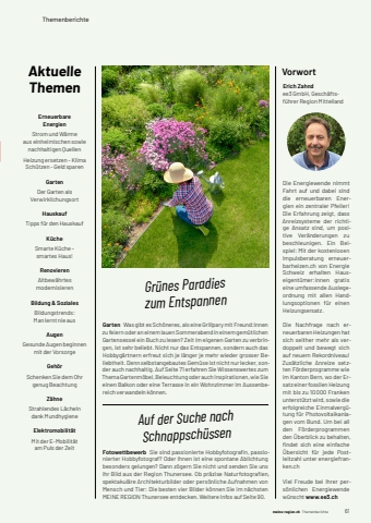meine-region.ch meine-region.ch Themenberichte 61ThemenberichteAktuelleThemenGarten Was gibt es Sch%u00f6neres, als eine Grillpary mit Freund:innen zu feiern oder an einem lauen Sommerabend in einem gem%u00fctlichen Gartensessel ein Buch zu lesen? Zeit im eigenen Garten zu verbringen, ist sehr beliebt. Nicht nur das Entspannen, sondern auch das Hobbyg%u00e4rtnern erfreut sich je l%u00e4nger je mehr wieder grosser Beliebtheit. Denn selbstangebautes Gem%u00fcse ist nicht nur lecker, sonder auch nachhaltig. Auf Seite 71 erfahren Sie Wissenswertes zum Thema Gartenm%u00f6bel, Beleuchtung oder auch Inspirationen, wie Sie einen Balkon oder eine Terrasse in ein Wohnzimmer im Aussenbereich verwandeln k%u00f6nnen. Fotowettbewerb Sie sind passionierte Hobbyfotografi n, passionierter Hobbyfotograf? Oder Ihnen ist eine spontane Ablichtung besonders gelungen? Dann z%u00f6gern Sie nicht und senden Sie uns Ihr Bild aus der Region Thunersee. Ob pr%u00e4zise Naturfotografi en, spektakul%u00e4re Architekturbilder oder pers%u00f6nliche Aufnahmen von Mensch und Tier: Die besten vier Bilder k%u00f6nnen Sie im n%u00e4chsten MEINE REGION Thunersee entdecken. Weitere Infos auf Seite 90.VorwortErich Zahndee3 GmbH, Gesch%u00e4ftsf%u00fchrer Region MittellandDie Energiewende nimmt Fahrt auf und dabei sind die erneuerbaren Energien ein zentraler Pfeiler! Die Erfahrung zeigt, dass Anreizsysteme der richtige Ansatz sind, um positive Ver%u00e4nderungen zu beschleunigen. Ein Beispiel: Mit der kostenlosen Impulsberatung erneuerbarheizen.ch von Energie Schweiz erhalten Hauseigent%u00fcmer:innen gratis eine umfassende Auslegeordnung mit allen Handlungsoptionen f%u00fcr einen Heizungsersatz.Die Nachfrage nach erneuerbaren Heizungen hat sich seither mehr als verdoppelt und bewegt sich auf neuem Rekordniveau! Zus%u00e4tzliche Anreize setzten F%u00f6rderprogramme wie im Kanton Bern, wo der Ersatz einer fossilen Heizung mit bis zu 10 000 Franken unterst%u00fctzt wird, sowie die erfolgreiche Einmalverg%u00fctung f%u00fcr Photovoltaikanlagen vom Bund. Um bei all den F%u00f6rderprogrammen den %u00dcberblick zu behalten, fi ndet sich eine einfache %u00dcbersicht f%u00fcr jede Postleitzahl unter energiefranken.chViel Freude bei Ihrer pers%u00f6nlichen Energiewende w%u00fcnscht www.ee3.chErneuerbare EnergienStrom und W%u00e4rme aus einheimischen sowie nachhaltigen QuellenHeizung ersetzen %u2013 Klima Sch%u00fctzen - Geld sparenGartenDer Garten als Verwirklichungsort HauskaufTipps f%u00fcr den HauskaufK%u00fccheSmarte K%u00fcche %u2013 smartes Haus!RenovierenAltbew%u00e4hrtes modernisierenBildung & SozialesBildungstrends: Man lernt nie ausAugenGesunde Augen beginnen mit der VorsorgeGeh%u00f6rSchenken Sie dem Ohr genug BeachtungZ%u00e4hneStrahlendes L%u00e4cheln dank MundhygieneElektromobilit%u00e4tMit der E-Mobilit%u00e4t am Puls der ZeitGr%u00fcnes Paradies zum EntspannenAuf der Suche nach Schnappsch%u00fcssenWir sorgen daf%u00fcr, dass unsere Kund:innen gesehen werden. Bei uns wirkt Werbung anders: Frontal. Regional. Genial. Mit Inhalt, der am%u00fcsiert, inspiriert und das Zielpublikum messerscharf avisiert. Na, schon interessiert?FAST EIN HALBES JAHRHUNDERT5fifffflffifl%u001a%u0019%u0018%u0017fifffflffifl%u001a%u0019%u0018ffiff%u0019%u0019%u0017%u0016%u0015%u0014%u0016%u0013%u0016%u0012%u0011%u0015%u0012%u0016%u0010%u000f%u000e%u0017%u000c%u000bffi%u0014%u0011%u0009%u0016%u0009%u0015%u0014%u0016%u0015%u0014%u0016%u0015%u0014%u0016%u0013%u0016%u0008%u0008%u0008%u0007%u0006fl%u0005%u0004ff%u0007%u0003Ein gutes Team ist der Schl%u00fcssel zum Erfolg!Die Heimat der Miplan liegt in H%u00e4gendorf im Kanton Solothurn. Wir besch%u00e4ftigen %u00fcber 40 Mitarbeitende in der gesamten Deutschschweiz in %u00fcber zehn unterschiedlichen Berufen. Ein:e Miplaner:in zu sein, bedeutet Teil eines engagierten, motivierten Teams zu sein. Gemeinsam feiern wir Erfolge und haben jede Menge Spass. Bei uns arbeiten sowohl j%u00fcngere als auch %u00e4ltere Generationen t%u00e4glich eng zusammen. Jeder kann von jedem lernen und gemeinsam bilden wir ein tolles Team. K%u00fcrzlich wurden wir als Arbeitgeberin mit dem kununu %u00abTOP Company Award 2023%u00bb ausgezeichnet. Darauf sind wir besonders stolz.Die Medienlandschaft ver%u00e4ndert sich rasend schnell. Um Schritt zu halten, braucht es einen starken Motor, sprich engagierte Mitarbeitende! Willst Teil unseres Teams werden? Informiere dich jetzt auf miplan.ch/jobs %u00fcber unsere offenen Stellen.Finden Sie jetzt Ihren Traumjob!