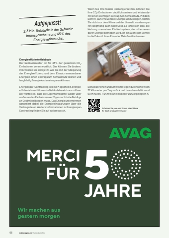 665 meine-region.ch meine-region.ch ThemenberichteEnergieeffi ziente Geb%u00e4udeDer Geb%u00e4udesektor ist f%u00fcr 33% der gesamten CO2-Emissionen verantwortlich. Das k%u00f6nnen Sie %u00e4ndern: Informieren Sie sich jetzt, wie Sie mit der Steigerung der Energieeffi zienz und dem Einsatz erneuerbarer Energien einen Beitrag zum Klimaschutz leisten und langfristig Energiekosten einsparen k%u00f6nnen. Energiespar-Contracting ist eine M%u00f6glichkeit, energieeffi ziente Investitionen im Geb%u00e4udebereich auszul%u00f6sen. Der Vorteil ist, dass die Eigentumspartei weder %u00fcber umfassendes Fachwissen verf%u00fcgen noch hohe Betr%u00e4ge an Geldmittel binden muss. Das Energieunternehmen garantiert dabei die Energieeinsparungen %u00fcber die Vertragsdauer. Weitere Informationen zu EnergiesparContracting fi nden Sie auf swissesco.ch.Wenn Sie Ihre fossile Heizung ersetzen, k%u00f6nnen Sie Ihre CO2-Emissionen deutlich senken und leisten damit einen wichtigen Beitrag zum Klimaschutz. Mit dem Schritt, auf erneuerbare Energie umzusteigen, helfen Sie nicht nur dem Klima und der Umwelt, sondern sparen langfristig auch noch Geld. Es lohnt sich also, die Heizung zu ersetzen. Ein Heizsystem, das mit erneuerbarer Energie betrieben wird, ist ein wichtiger Schritt in die Zukunft Ihres Ein- oder Mehrfamilienhauses.Schweizerinnen und Schweizer legen durchschnittlich 37 Kilometer pro Tag zur%u00fcck und brauchen daf%u00fcr rund 90 Minuten. F%u00fcr zwei Drittel dieser zur%u00fcckgelegten KiAufgepasst!2.3 Mio. Geb%u00e4ude in der Schweiz beanspruchen rund 45 % des Energieverbrauchs.Erfahren%u0009Sie,%u0009wie%u0009viel%u0009Strom%u0009oder%u0009W%u00e4me%u0009Ihr Dach produzieren kann!Inserat halbseitig, 186 x 134 mm