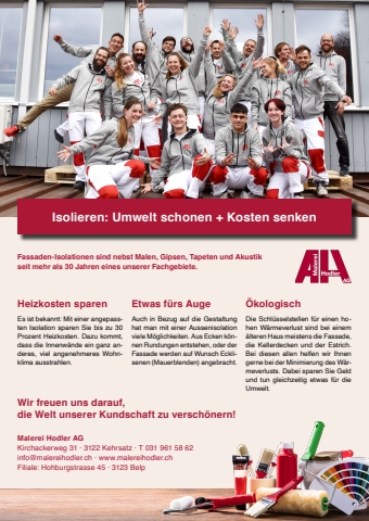 68 meine-region.ch ThemenberichteHeizkosten sparenEs ist bekannt: Mit einer angepassten Isolation sparen Sie bis zu 30 Prozent Heizkosten. Dazu kommt, dass die Innenw%u00e4nde ein ganz anderes, viel angenehmeres Wohnklima ausstrahlen.Etwas f%u00fcrs AugeAuch in Bezug auf die Gestaltung hat man mit einer Aussenisolation viele M%u00f6glichkeiten. Aus Ecken k%u00f6nnen Rundungen entstehen, oder der Fassade werden auf Wunsch Ecklisenen (Mauerblenden) angebracht.%u00d6kologischDie Schl%u00fcsselstellen f%u00fcr einen hohen W%u00e4rmeverlust sind bei einem %u00e4lteren Haus meistens die Fassade, die Kellerdecken und der Estrich. Bei diesen allen helfen wir Ihnen gerne bei der Minimierung des W%u00e4rmeverlusts. Dabei sparen Sie Geld und tun gleichzeitig etwas f%u00fcr die Umwelt.Fassaden-Isolationen sind nebst Malen, Gipsen, Tapeten und Akustik seit mehr als 30 Jahren eines unserer Fachgebiete. Wir freuen uns darauf, die Welt unserer Kundschaft zu versch%u00f6nern!Isolieren: Umwelt schonen + Kosten senkenMalerei Hodler AGKirchackerweg 31 %u00b7 3122 Kehrsatz %u00b7 T 031 961 58 62info@malereihodler.ch %u00b7 www.malereihodler.chFiliale: Hohburgstrasse 45 %u00b7 3123 Belp