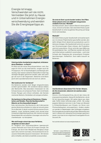 meine-region.ch meine-region.ch Themenberichte 698Viele beurteilen Autobatterien skeptisch, kritisieren deren %u00d6kobilanz %u2013 zu Recht?Mit Blick auf die neuen Recyclingverfahren: nein. Das sage ich nicht nur als Unternehmer, sondern auch als Privatperson. Mir ist Nachhaltigkeit und %u00d6kologie sehr wichtig. Klar m%u00fcssen weiterhin Rohstoffe im teils fragw%u00fcrdigen Bergbau gewonnen werden, aber weit weniger als noch in der Gegenwart. Batterien sind %u00f6kologisch weit unproblematischer als noch vor Jahren.Wie funktioniert Ihr Verfahren?Die Batterien werden nicht l%u00e4nger eingeschmolzen, sondern geschreddert. Wir sondieren daraus nahezu alle Werkstoffe. Was besonders interessant ist: die Schwarzmasse, ein schwarzes Pulver. Darin sind Kobalt, Nickel, Mangan und Lithium enthalten, die Kernelemente der Batterie. Sie bleiben voll und ganz erhalten.Sie hantieren im Recycling mit Reststrom, Fl%u00fcssigkeiten und Metallen. Muss die Nachbarschaft in Biberist um Ihre Gesundheit bangen?Nein, kein bisschen. Den Reststrom, der in den ausrangierten Batterien enthalten ist, leiten wir ab und nutzen ihn im Betrieb. Er deckt rund ein Drittel unseres Strombedarfs. Unser Verfahren bedarf nicht einmal einer Umweltvertr%u00e4glichkeitspr%u00fcfung. Wir sind ein normaler Gewerbebetrieb und arbeiten sozusagen wie eine Mechanikerbude %u2013 nur komplexer.Wie viel Energie schont das neue Verfahren, verglichen mit dem alten?Im Vergleich zum Schmelzverfahren beansprucht unsere Methode noch 15 bis 20 Prozent Energie. Die Energie, die durch den Wegfall des Bergbaus eingespart wird, kommt noch dazu. Die Autoindustrie ist an unseren Rohstoffen %u00e4usserst interessiert. Wir k%u00f6nnen aktiv mithelfen, die Elektromobilit%u00e4t voranzutreibenSie sind ein Start-up wie hundert andere. Ihre Pl%u00e4ne l%u00f6sten jedoch schon von Anbeginn weg grosses mediales Echo aus. Weshalb?Das Bewusstsein, dass in diesem Bereich etwas gehen muss, ist breit vorhanden. Denn die Elektrifi zierung der Gesellschaft ist ohne taugliches Recycling auf lange Sicht nicht denkbar. Weshalb?Die Elektrifi zierung der Gesellschaft wird weiterwachsen. Es m%u00fcssen M%u00f6glichkeiten geschaffen werden, den daf%u00fcr n%u00f6tigen Strom dezentral zu produzieren, auch in kleineren Anlagen. Die Gesellschaft wird sich von grossen Stromversorgern l%u00f6sen m%u00fcssen, die Produktion wird sich granulieren. Strom wird die neue W%u00e4hrung. Die gestiegenen Gas- und %u00d6lpreise werden die Suche nach Alternativen zus%u00e4tzlich vorantreiben %u2013 und in der Schweiz den Siegeszug der erneuerbaren Energien beschleunigen. Hoffentlich. Doch daf%u00fcr braucht es Batterien. Und Sie k%u00f6nnen diese bieten? Ein Teil der Altware, die Sie einsammeln, bekommt ein zweites Leben geschenkt.Stimmt. Eine Schwesterfi rma, die mit der Librec AG eng zusammenarbeitet, %u00fcberpr%u00fcft die Batterien, ob sie f%u00fcr ein Upcycling taugen. Wir gehen davon aus, dass jede f%u00fcnfte diese Anforderungen erf%u00fcllt. Die aufgepeppten Batterien kommen in der Folge zum Beispiel in Einfamilienh%u00e4usern zum Einsatz, um Strom vom Photovoltaiksystem einzuspeichern. Andere wiederum werden in Gabelstapler oder Golfwagen eingebaut. Die Energiebranche denkt aktuell %u00fcber Batteriefarmen nach, in denen sich relevante Strommengen speichern lassen. Auch das ist ein m%u00f6gliches Einsatzgebiet f%u00fcr ein Second Life.Text und Informationen von www.energieschweiz.chEnergie ist knapp. Verschwenden wir sie nicht. Vermeiden Sie jetzt zu Hause und in Unternehmen Energieverschwendung und wenden Sie die Energiespartipps an.Seit dem 1. Januar 2023 ist ein neues Kantonales Energiegesetz in Kraft. Erfahren Sie jetzt mehr dar%u00fcber!Inserat ganzseitig, 210 x 297 mmHeizkosten sparenEs ist bekannt: Mit einer angepass,ten Isolation sparen Sie bis zu 30 Prozent Heizkosten. Dazu kommt, dass die Innenw%u00e4nde ein ganz an,deres, viel angenehmeres Wohn,klima ausstrahlen.Etwas f%u00fcrs AugeAuch in Bezug auf die Gestaltung hat man mit einer Aussenisolation viele M%u00f6glichkeiten. Aus Ecken k%u00f6n,nen Rundungen entstehen, oder der Fassade werden auf Wunsch Eckli,senen (Mauerblenden) angebracht.%u00d6kologischDie Schl%u00fcsselstellen f%u00fcr einen ho,hen W%u00e4rmeverlust sind bei einem %u00e4lteren Haus meistens die Fassade, die Kellerdecken und der Estrich. Bei diesen allen helfen wir Ihnen gerne bei der Minimierung des W%u00e4r,meverlusts. Dabei sparen Sie Geld und tun gleichzeitig etwas f%u00fcr die Umwelt.Fassaden-Isolationen sind nebst Malen, Gipsen, Tapeten und Akustik seit mehr als 30 Jahren eines unserer Fachgebiete. Wir freuen uns darauf, die Welt unserer Kundschaft zu versch%u00f6nern!Isolieren: Umwelt schonen + Kosten senkenMalerei Hodler AGKirchackerweg 31 %u00b7 3122 Kehrsatz %u00b7 T 031 961 58 62info@malereihodler.ch %u00b7 www.malereihodler.chFiliale: Hohburgstrasse 45 %u00b7 3123 Belp